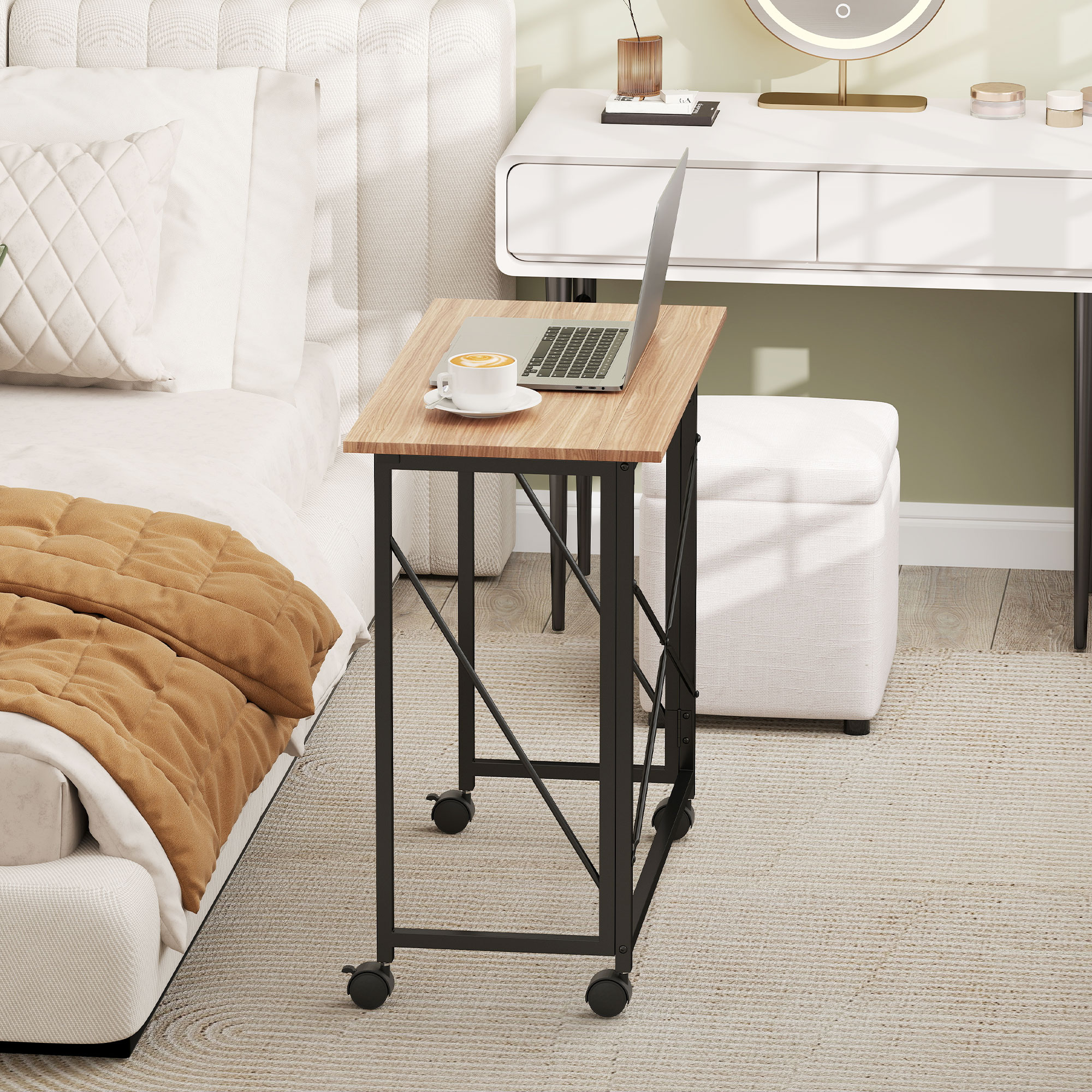 1Maak kennis met het handige bureau-opslag dat een perfecte aanvulling is op elke kamer! Dit slanke, opklapbare bureau is de ideale oplossing voor beperkte ruimtes, omdat het moeiteloos achter een deur of onder meubels kan worden opgeborgen. Met vier soepel rollende wielen, waarvan twee met remmen, is dit bureau perfect voor thuiswerken, studeren of als kleine computertafel.