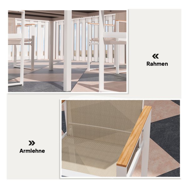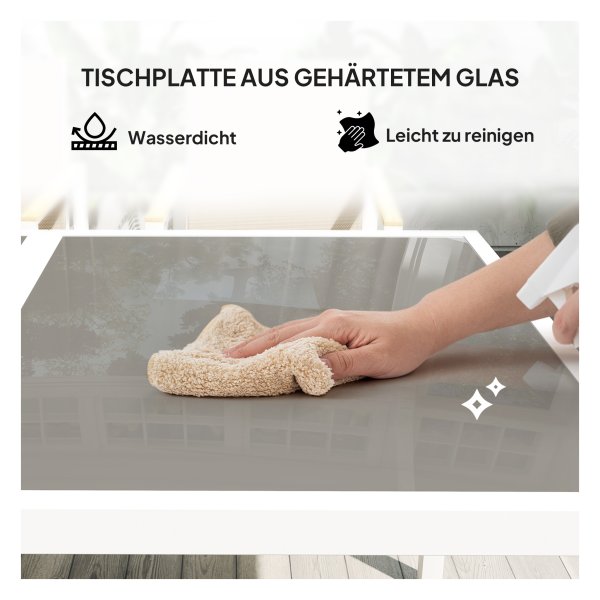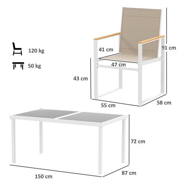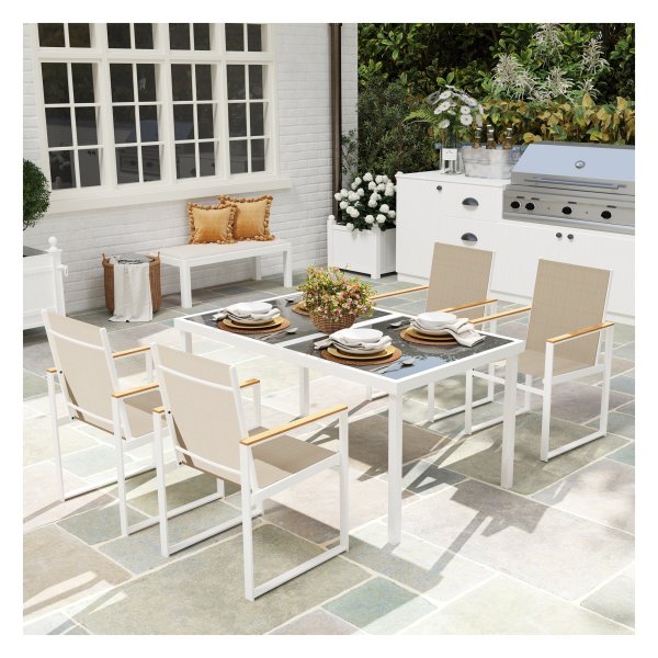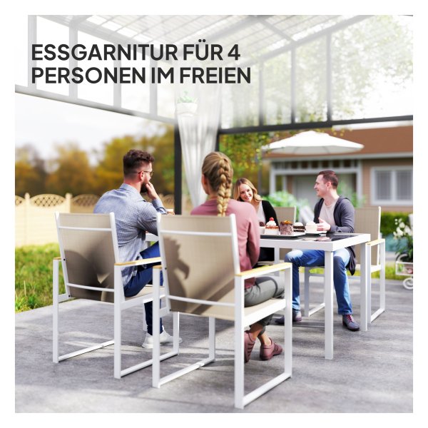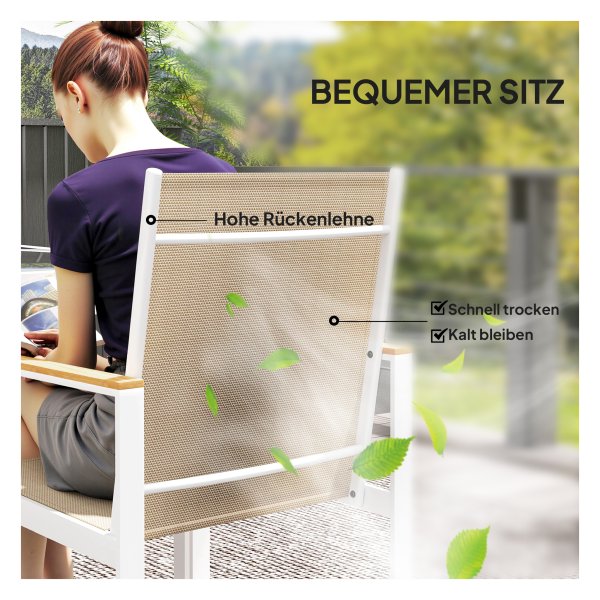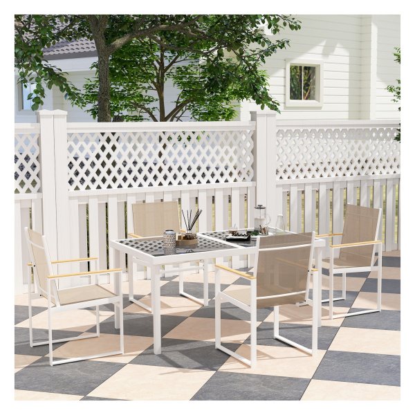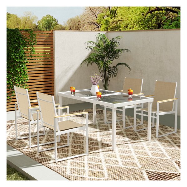 The garden furniture set transforms your dining area with an elegant design and comfortable chairs. The tempered glass table makes cleaning easy, and the breathable material ensures comfort, while the steel frame guarantees durability. Enjoy sunny meals.