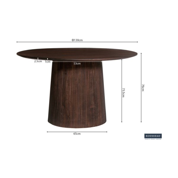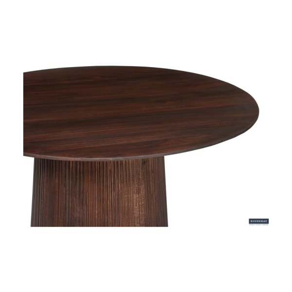 Bullet Point 3 | – – De eettafel 'Miguel' 130 cm Rond Donkerbruin beschikt over handige opbergruimte in de vorm van een structuur en blad van massief hout Mangolia, wat bijdraagt aan een georganiseerde en stijlvolle woonruimte. |