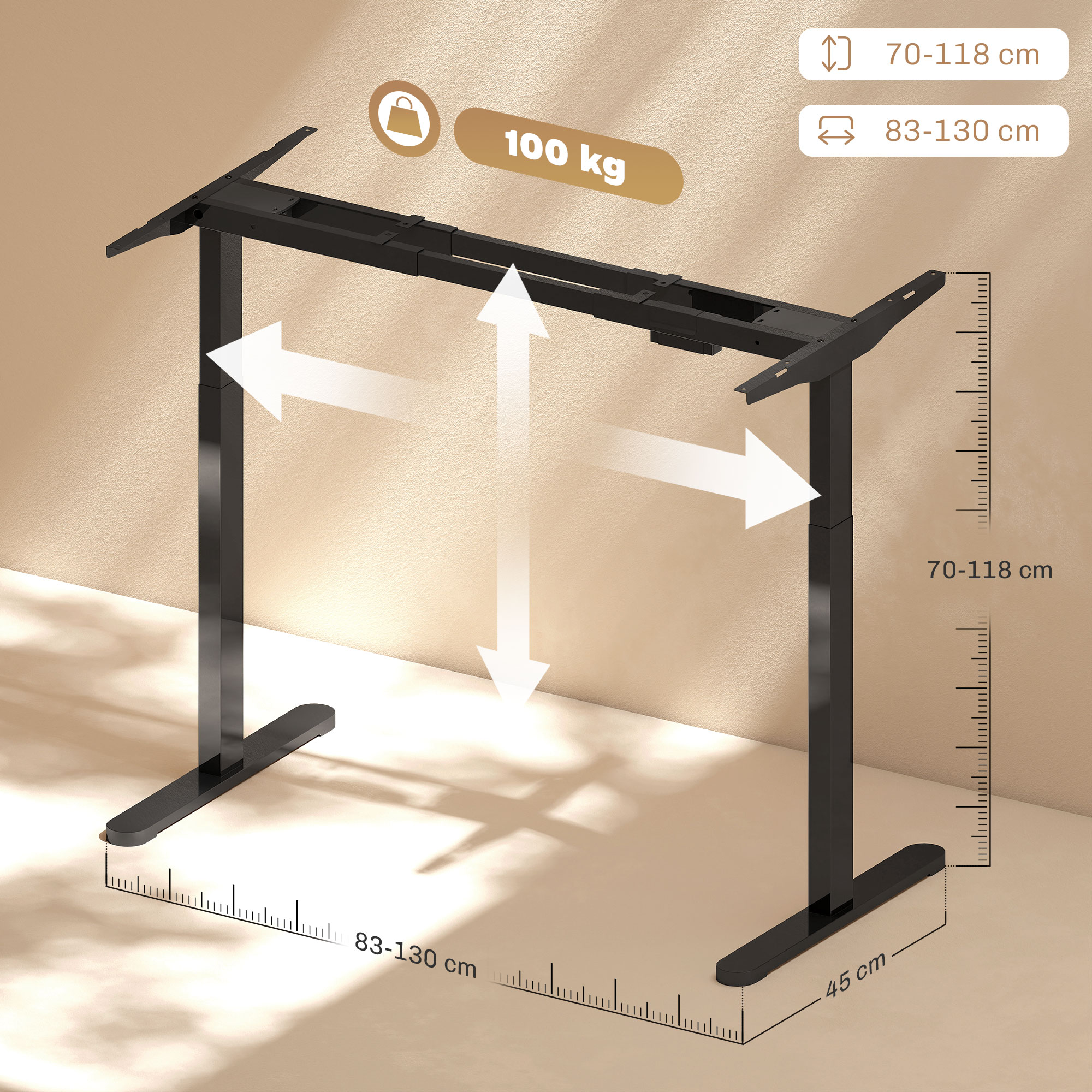 1Maak kennis met de zwarte elektrisch verstelbare bureauframe, ontworpen om stijlvol en ergonomisch comfort te bieden tijdens uw werkdag. Met dit frame kunt u moeiteloos uw werkruimte aanpassen, met een hoogteverstelling van 70 cm tot 118 cm en een breedteverstelling van 83 cm tot 130 cm. De krachtige dubbelaandrijving motoren zorgen voor snelle en geruisloze veranderingen, terwijl drie handige geheugenfuncties u helpen uw favoriete instellingen te onthouden.