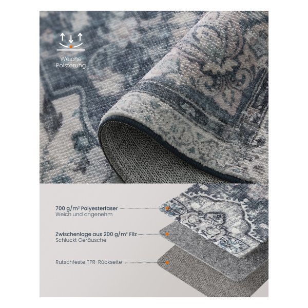 Voorzien van zacht 700 g/m² polyester en 200 g/m² vilt, biedt dit tapijt comfort en duurzaamheid. Het vintage ontwerp en antislip achterkant maken het geschikt voor verschillende vloeren. Inclusief handige opslag en transportopties.