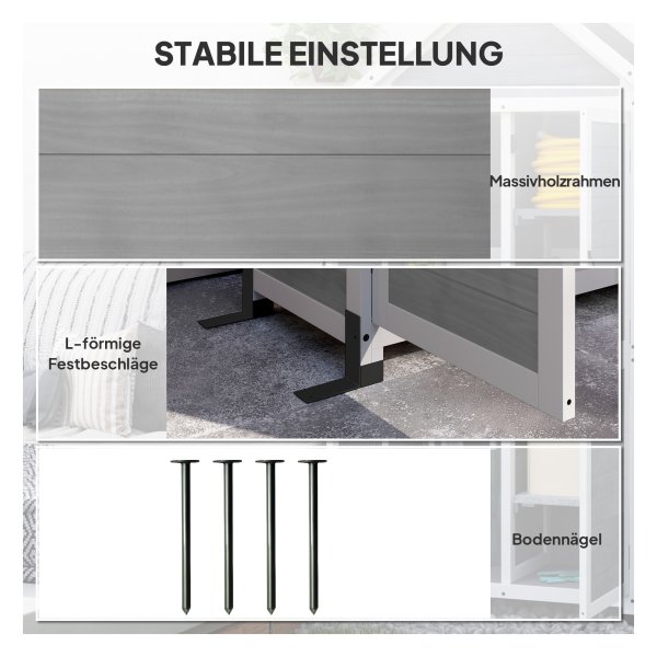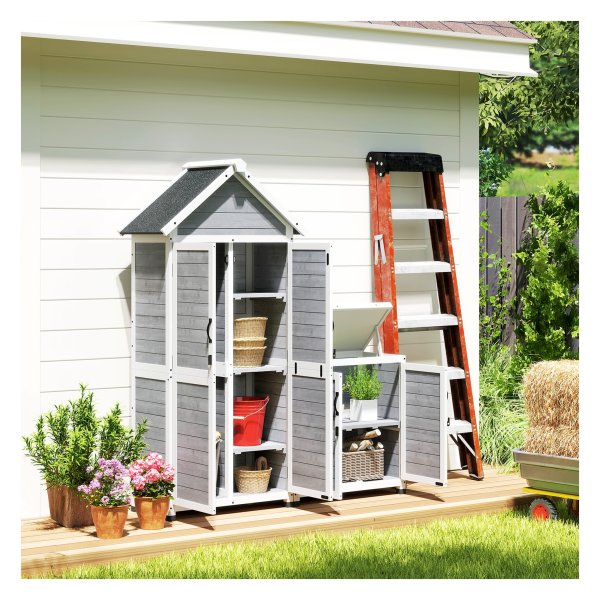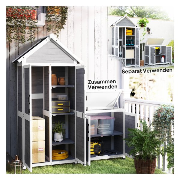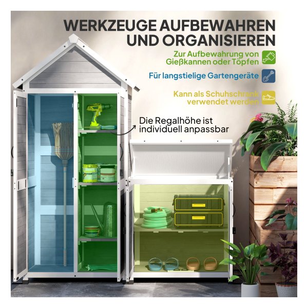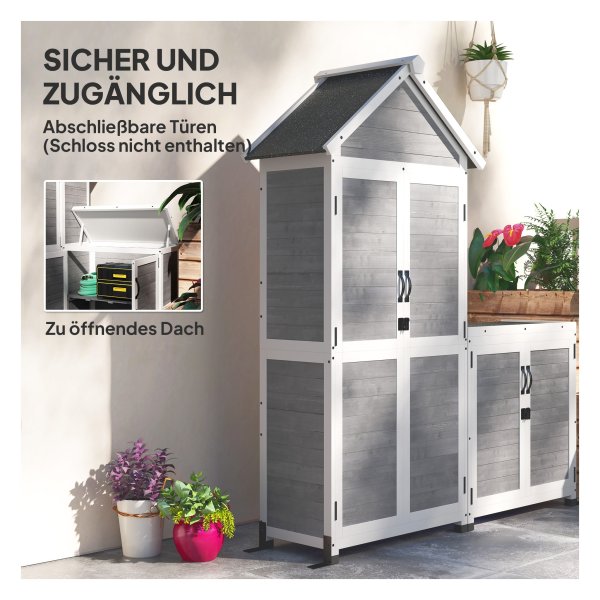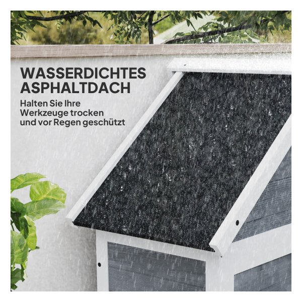 Der Outsunny Gartenschrank ist eine vielseitige und wetterfeste Lagerlösung aus Tannenholz. Mit abschließbaren Türen, verstellbaren Regalen und einem wasserdichten Asphalt-Dach, bietet er sicheren und trockenen Stauraum für Gartenutensilien. Belastbarkeit: 41.