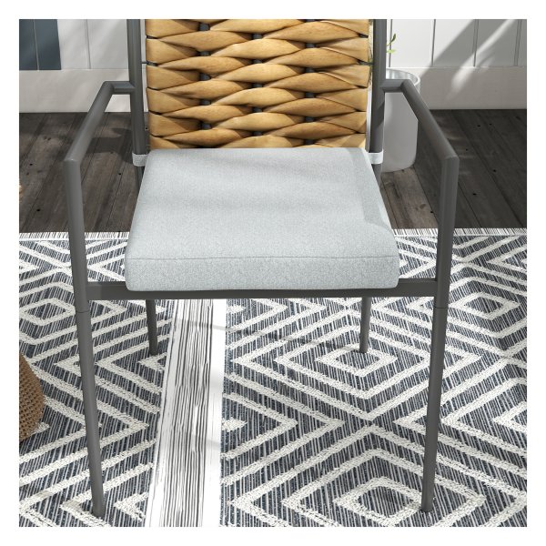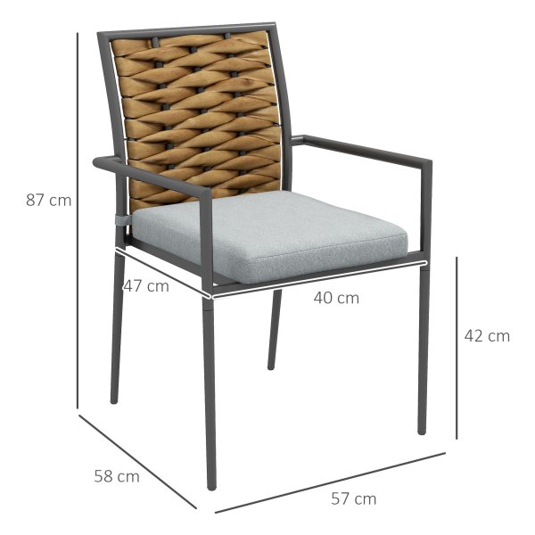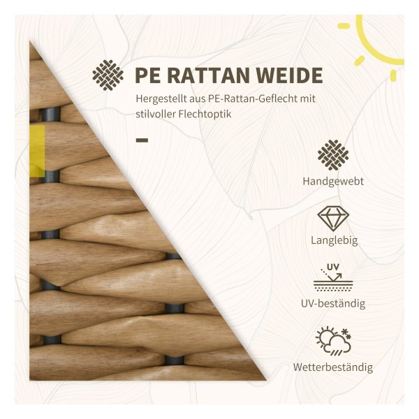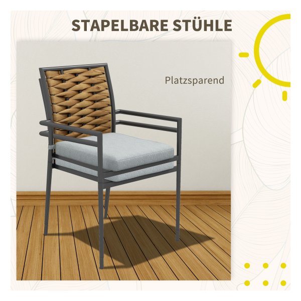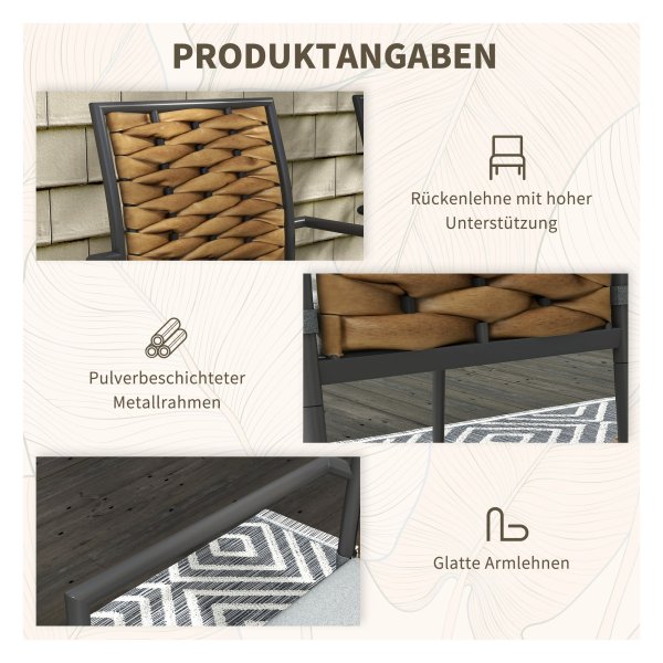 De stalen frames van de stoelen zijn voorzien van een duurzame poedercoating en omwikkeld met weerbestendig PE-Rattan, waardoor ze bestand zijn tegen de elementen en lang meegaan. De unieke vlechtstructuur zorgt voor een stijlvolle uitstraling en extra stevigheid.