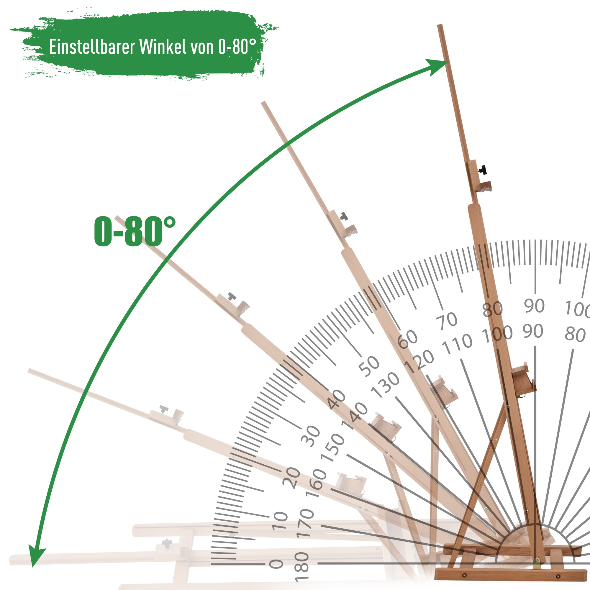 De hoek van het frame is variabel tussen 0 en 80 graden, waardoor u de perfecte werkhouding kunt kiezen voor maximaal comfort tijdens het schilderen. Daarbij is de hoogte van de easel verstelbaar van 171 tot 230 cm, zodat u zowel zittend als staand kunt werken.