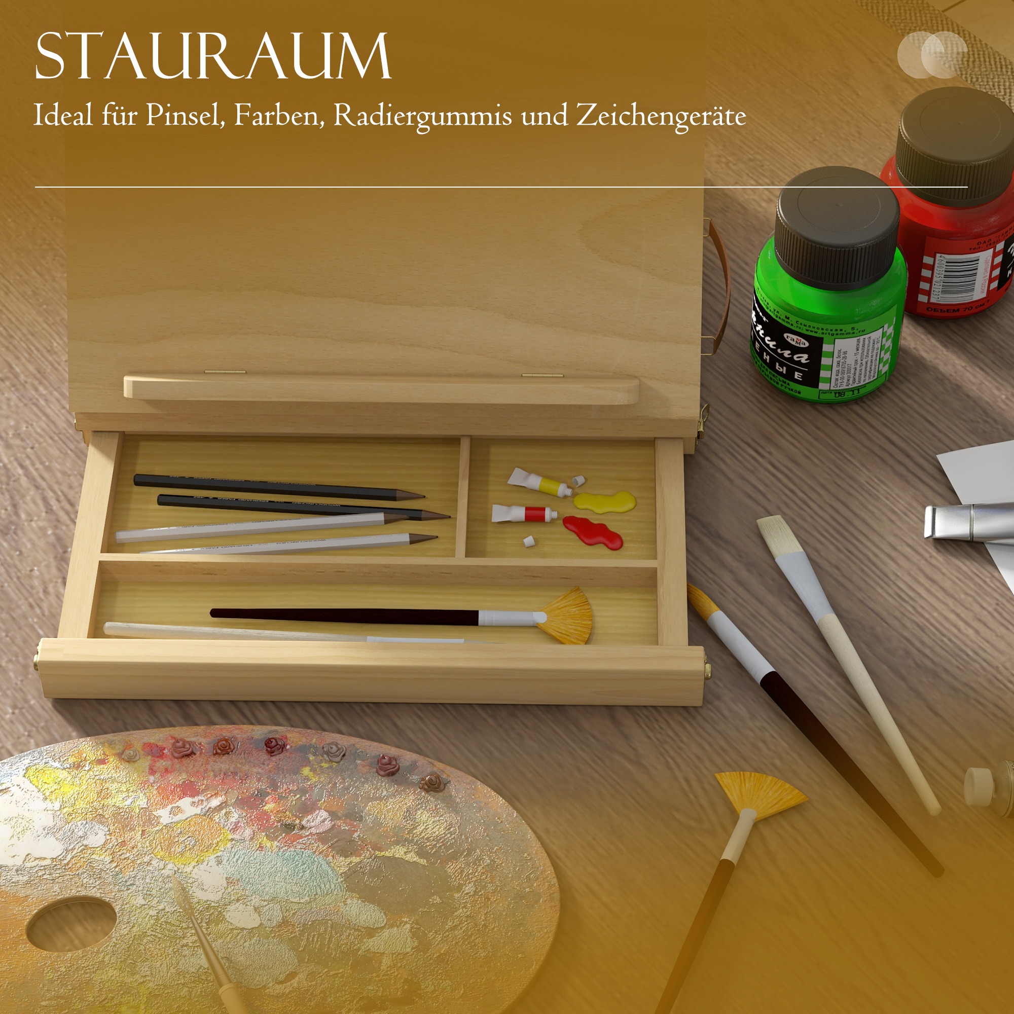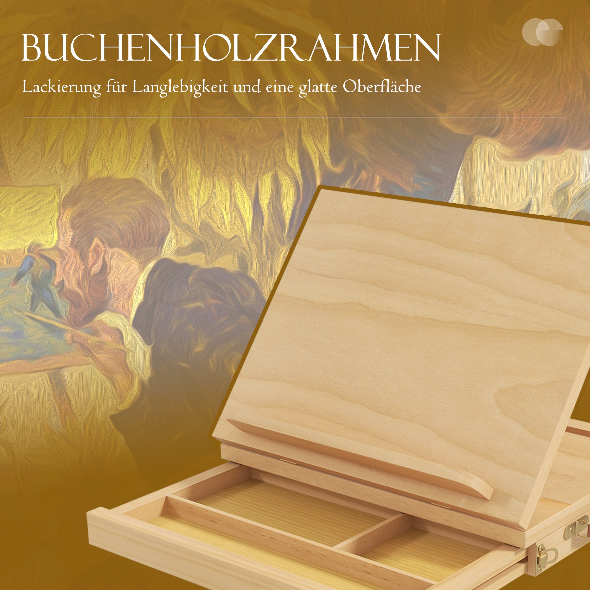 De schildersezel is vervaardigd van hoogwaardig beukenhout in een natuurlijke kleur. De afmetingen bij gebruik zijn 33,5 cm lang, 26 cm breed en 26 cm hoog, terwijl de afmetingen bij opgevouwen ezel 33,5 cm breed, 26 cm lang en 7 cm hoog zijn. Met een framehoek die verstelbaar is van 0 ° tot 57 °, biedt deze ezel de flexibiliteit die nodig is voor al je artistieke projecten.