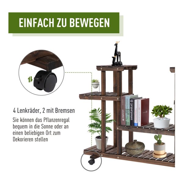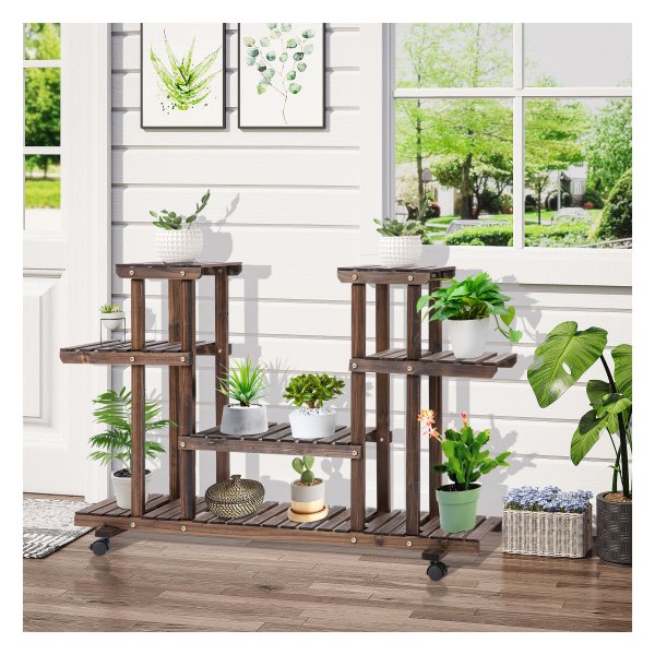 Op zoek naar een prachtige toevoeging voor zowel binnen- als buitenruimtes? Dan is de Bloementrap -Home – Vierlaags – Massief hout – Bruin precies wat u nodig heeft. Deze mobiele bloementrap biedt niet alleen ruimte aan uw geliefde planten, maar kan ook gebruikt worden als decoratieve plank voor boeken en andere items. Met zijn vier niveaus en zes planken, is er voldoende ruimte om uw groene vrienden te laten stralen.