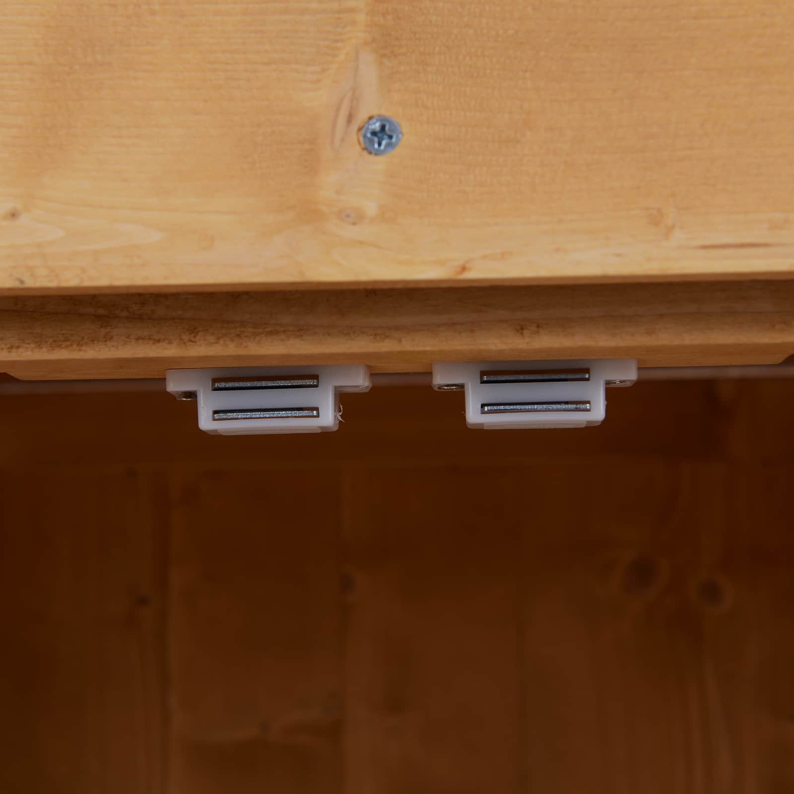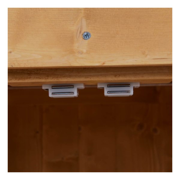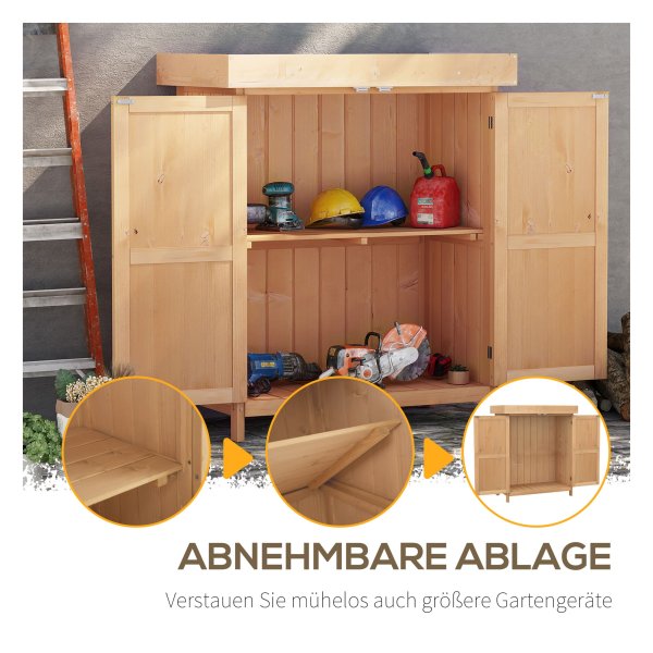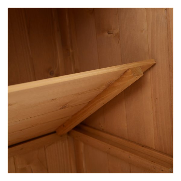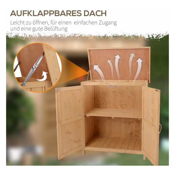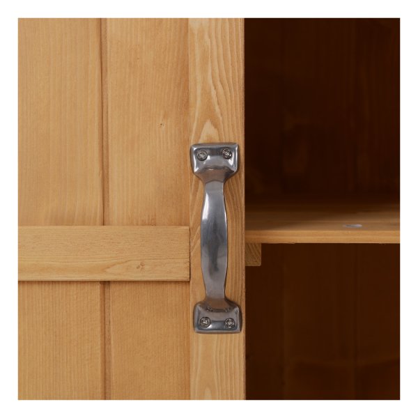 De tuinschuur is uitgerust met dubbele deuren met handgrepen voor een comfortabele sluiting. Zo kunt u gemakkelijk al uw gereedschap opbergen en weer tevoorschijn halen wanneer u het nodig heeft. De deuren zorgen voor een vlotte toegang tot uw gereedschap zonder gedoe.