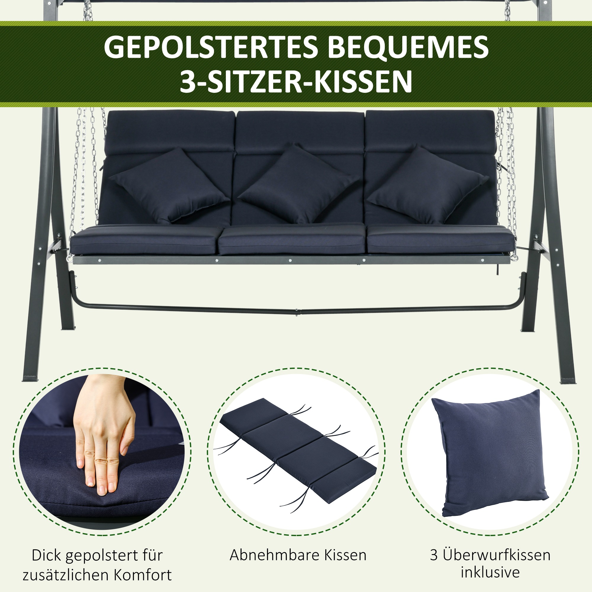 Bij de Schommelbank Hollywood ontvangt u niet alleen de schommelbank zelf, maar ook drie zitplaatsen en drie kussens voor extra comfort. Daarnaast wordt een duidelijke montage-instructie meegeleverd voor een eenvoudige en snelle installatie.