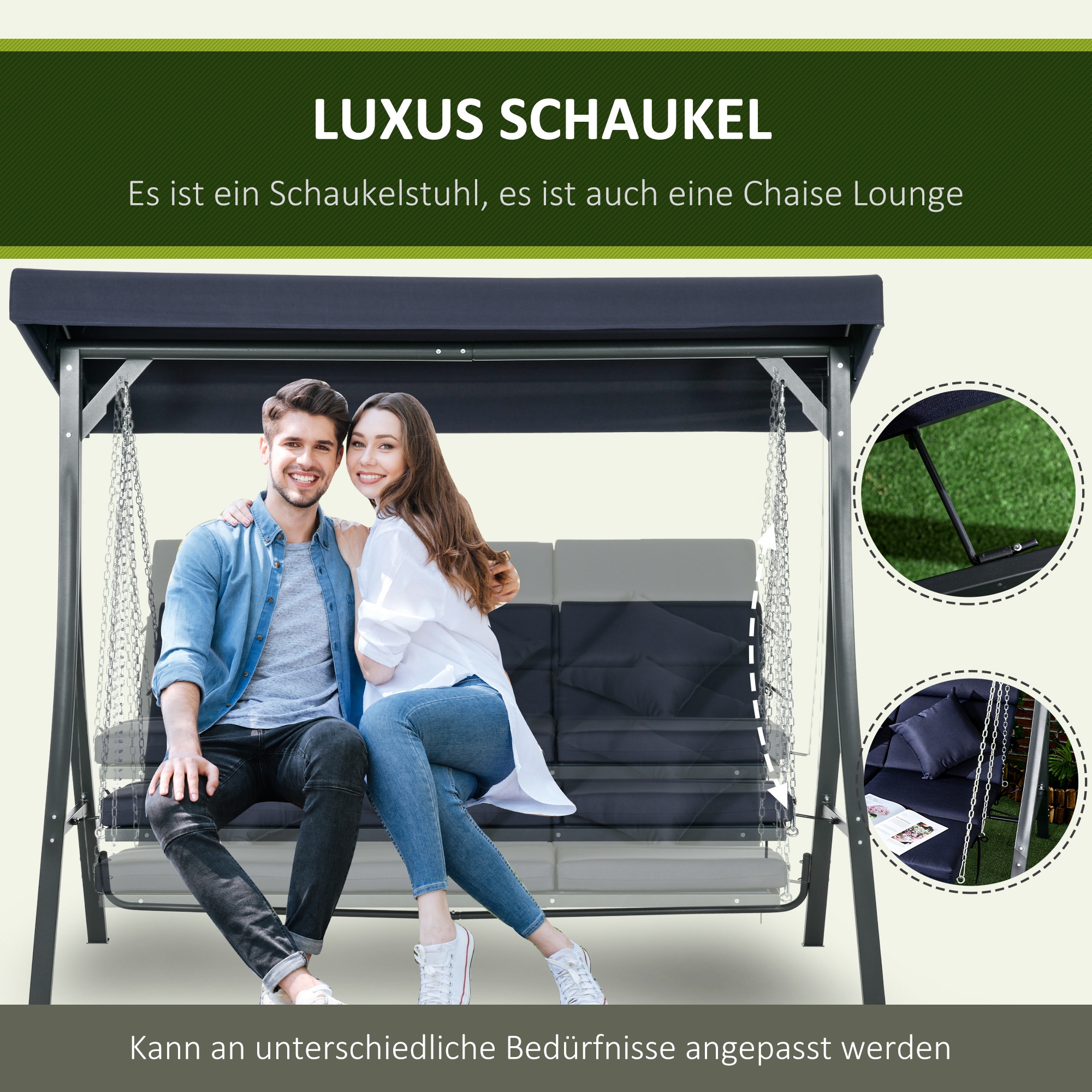 Het verstelbare zonnedak van de Schommelbank Hollywood zorgt ervoor dat u op elk moment van de dag beschermd bent tegen de zon. Bovendien kunt u de zonbescherming eenvoudig aanpassen, zodat u altijd optimaal kunt genieten van uw schommelervaring.
