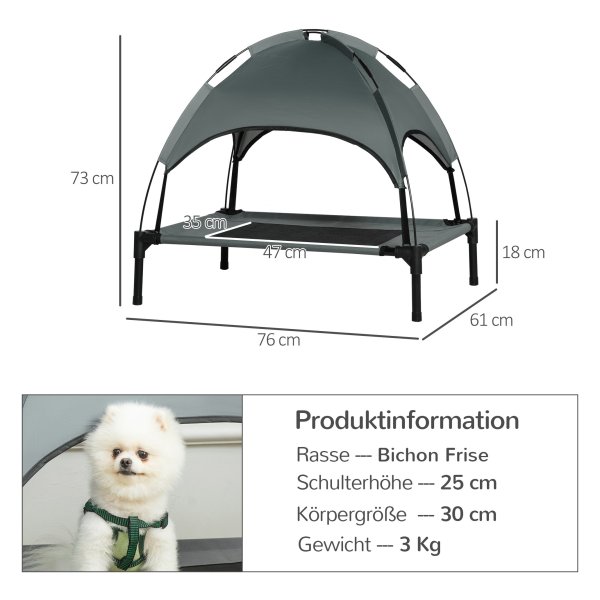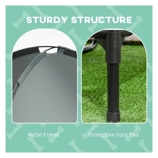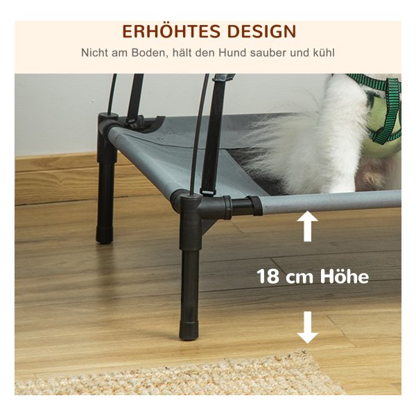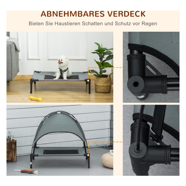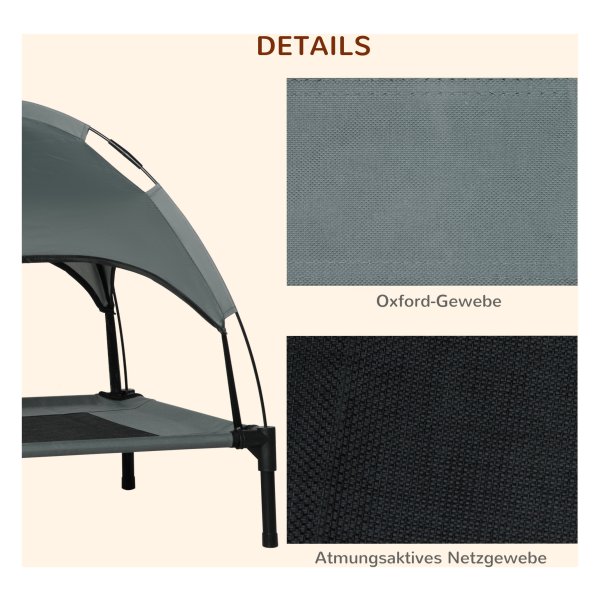 De stoffenbedekking van het hondenbed is ademend polyester, wat zorgt voor een gereguleerde lichaamstemperatuur voor uw huisdier. Het luifel dak biedt extra comfort en schaduw op warme dagen, met UV-bescherming en gemakkelijke bevestiging voor optimale rust.