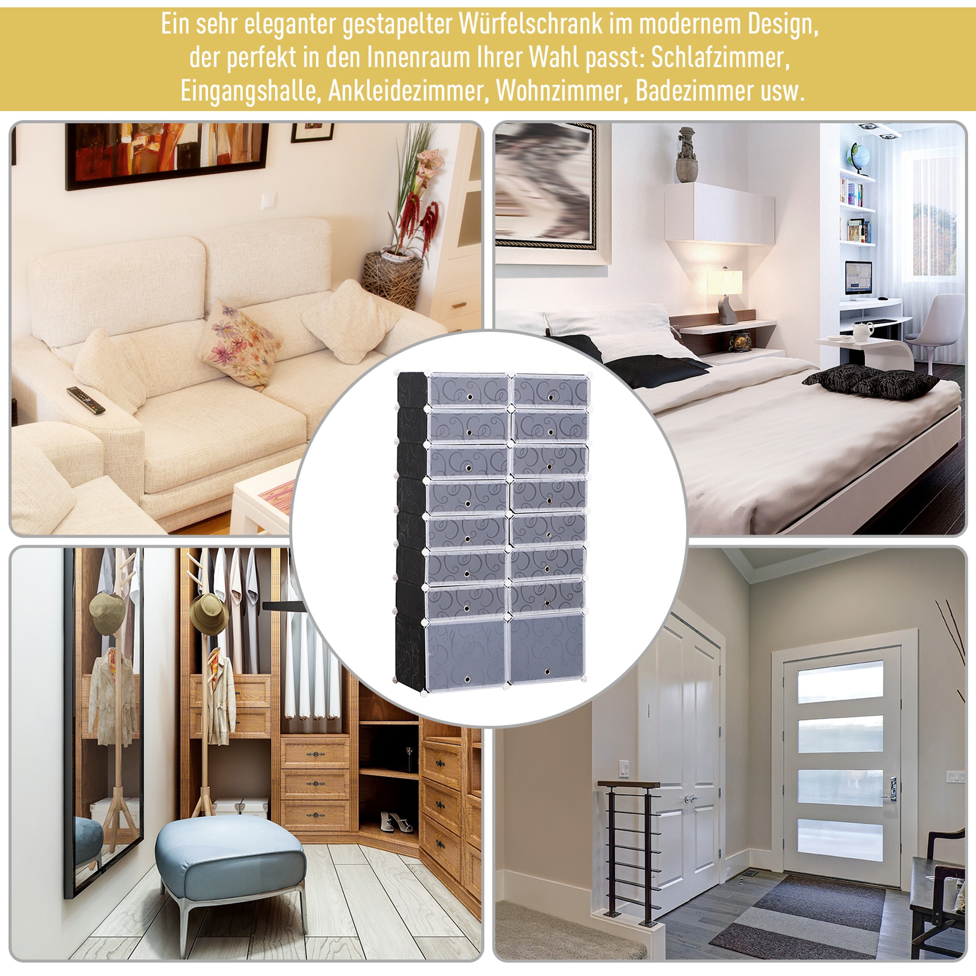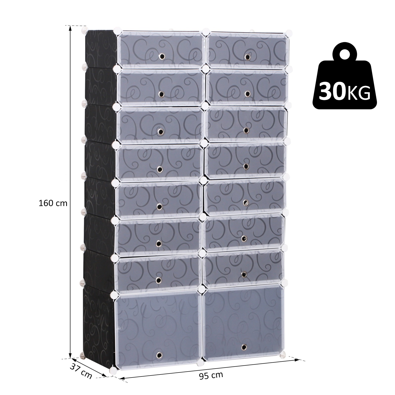 De zwarte en witte kleuren geven een chique uitstraling aan uw opslagruimte, of het nu gebruikt wordt als schoenkast, kamerscheider of voor universele opslag. Met 14 kleine en 2 grote compartimenten biedt deze opberger veel ruimte voor maximaal 32 paar schoenen. De metalen oogjes in elke deur maken het gemakkelijk te openen, terwijl de duurzame constructie van plastic en metaal zorgt voor een stevige opbergoplossing. Daarnaast is de opberger eenvoudig te monteren en te onderhouden.