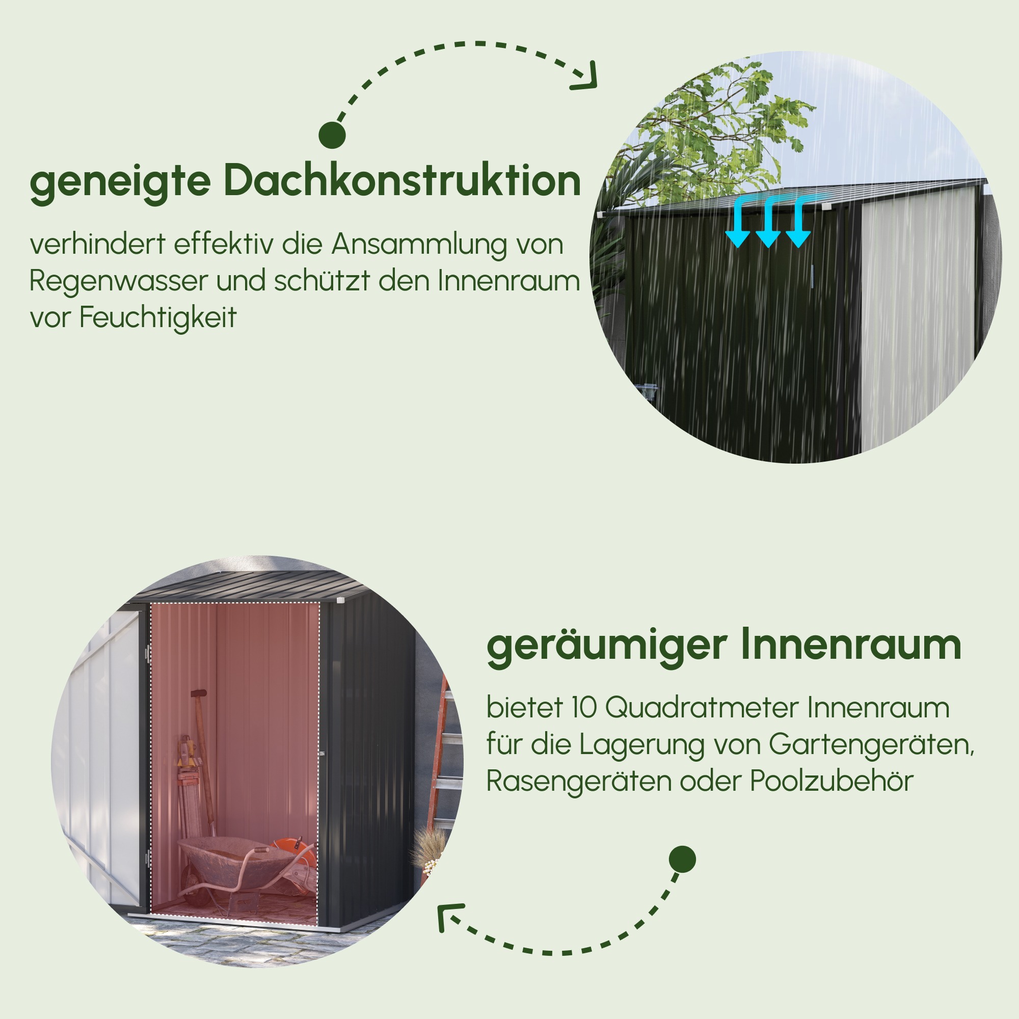 Vergroot eenvoudig de opslagruimte en de waarde van uw woning met deze robuuste tuinschuur van gegalvaniseerd staal in een stijlvolle donkergrijze kleur. Deze tuinschuur biedt duidelijke voordelen ten opzichte van traditionele houten modellen, waardoor het een slimme keuze is voor al uw opslagbehoeften.