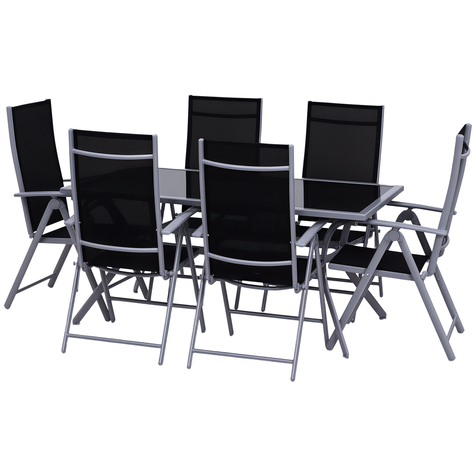 Deze tuinmeubelset is perfect voor elk balkon, terras of tuin. Met zijn nobele tafelblad van veiligheidsglas en 6 comfortabele stoelen, is deze set ideaal voor zowel ontspannen als dineren in de buitenlucht. De verstelbare rugleuningen van de stoelen zorgen voor extra comfort en kunnen worden aangepast in meerdere posities, waardoor je kunt genieten van zitten of liggen in stijl.