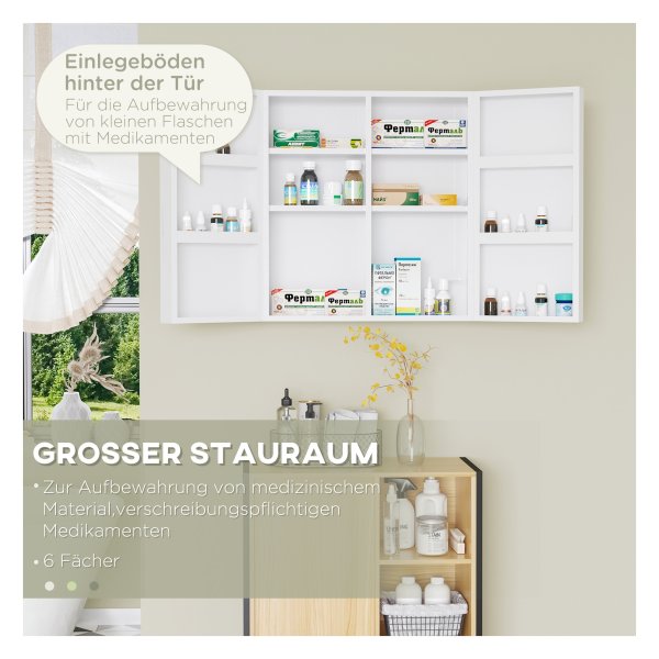 Het medicijnkastje biedt 6 planken in het interieur, waardoor je medicijnen overzichtelijk kunt ordenen en scheiden. Hierdoor vind je altijd snel het juiste medicijn wanneer dat nodig is. Daarnaast zijn er aan de achterkant van de deur 3 kleinere compartimenten voor het opbergen van kleinere medicijnverpakkingen, zodat alles netjes op zijn plaats blijft.