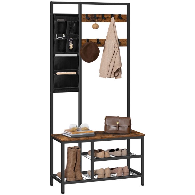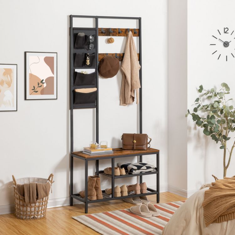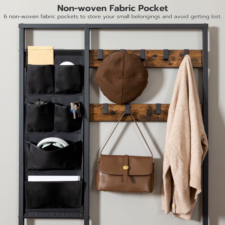 | Bullet Point 2 | 4-in-1 Spacesaver: ingangskastrek, schoenbank, schoenenrek, grote opbergzak-Vier functies maken dagelijks essentieel op de gangboom gemakkelijk toegankelijk als u te druk hebt om huishoudelijk werk te doen.9 haken zijn bedoeld om jassen en tassen, niet-geweven zakken op te hangen om toetsen, documenten of schattige poppen op te slaan, en het biedt ook twee metalen schoenrekken en een stevige bank.Je zit er comfortabel op bij het veranderen van schoenen |