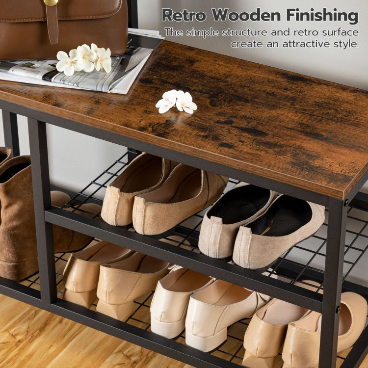 | Bullet Point 1 | Retro industrieel uiterlijk: rustieke retro -kleurenpanelen, black metalen frame construeren deze multifunctionele cad -rack schoenbank, om te voldoen aan opslagfuncties en artistieke behoeften.Het retro- en minimalistische ontwerp geeft een gevoel van elegantie en kan goed worden gecombineerd met uw huis en kantoor |