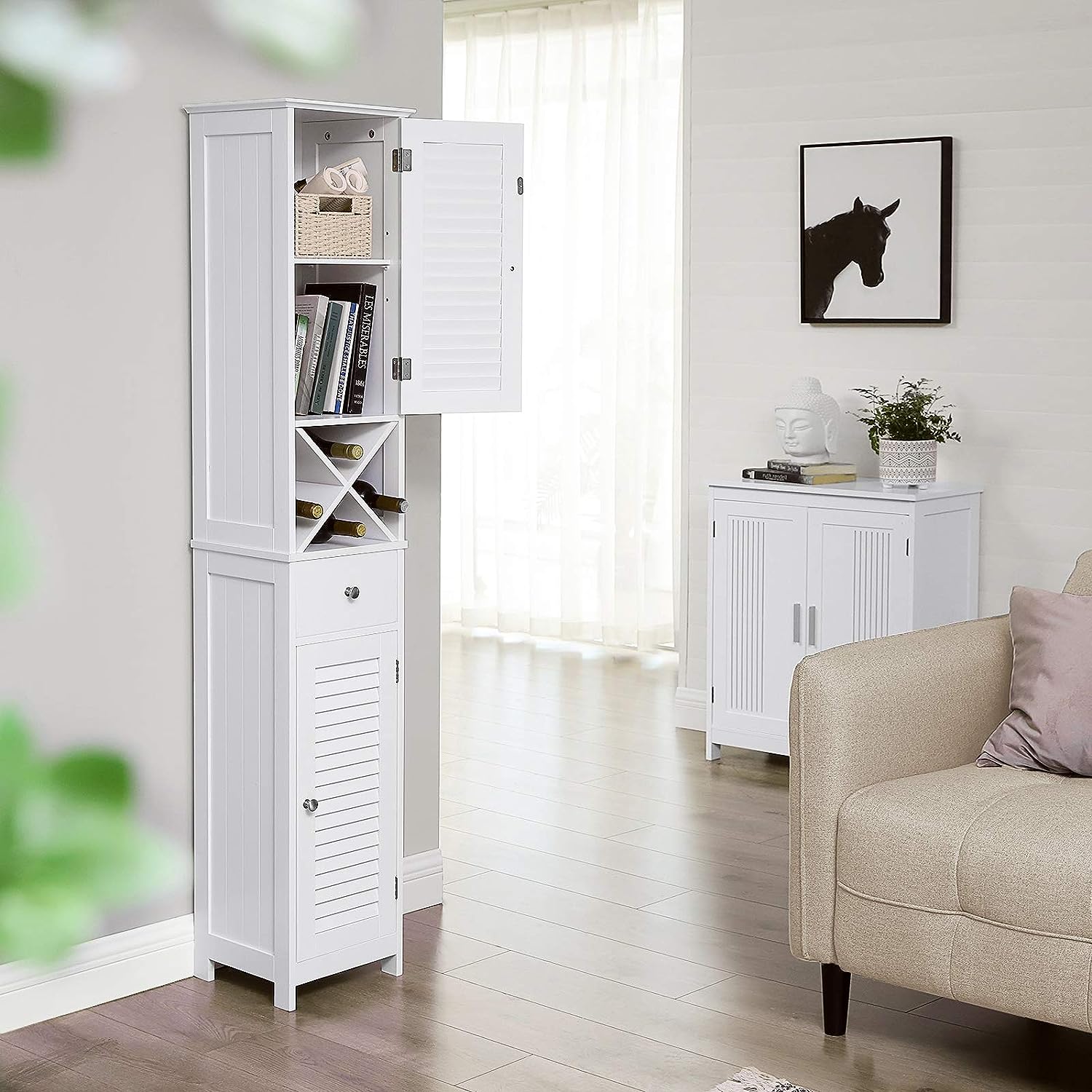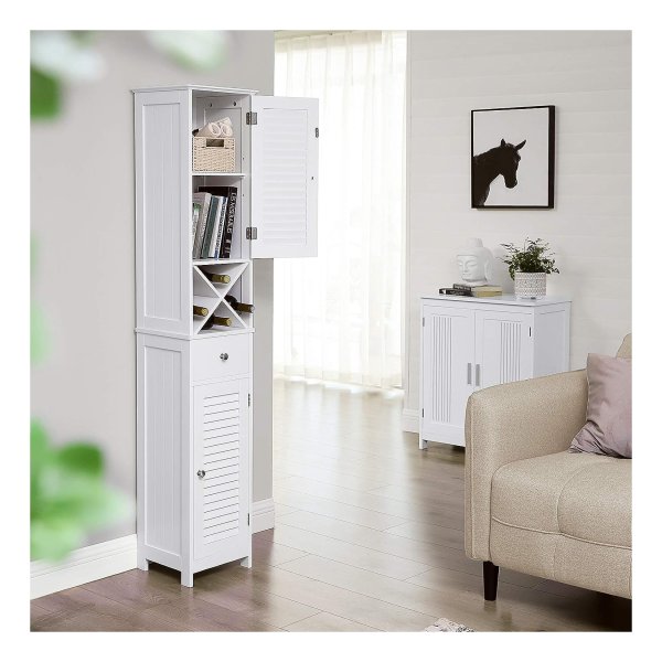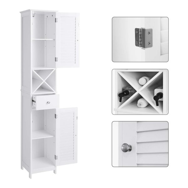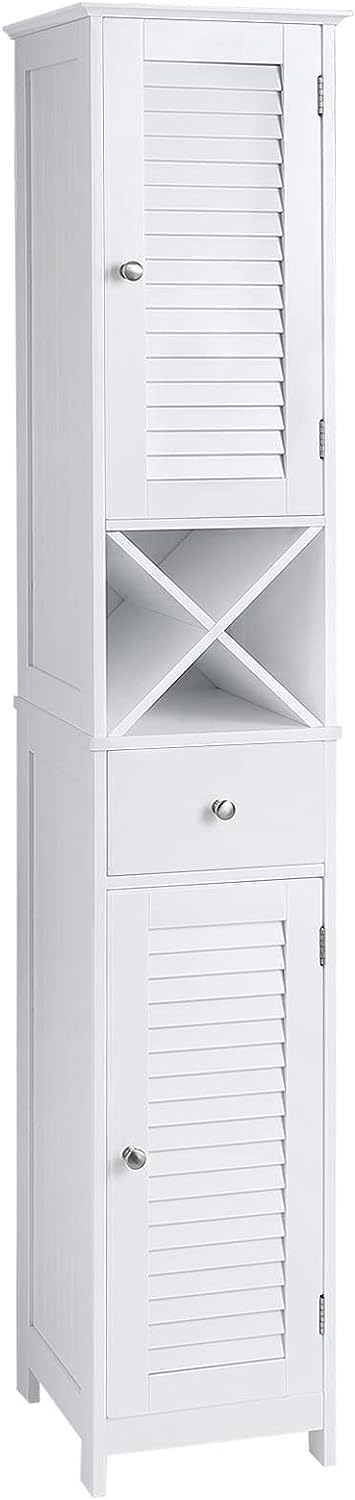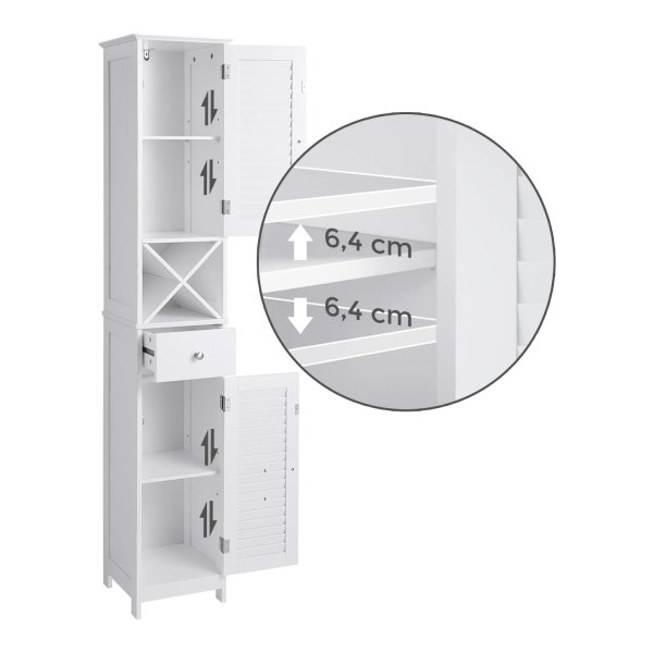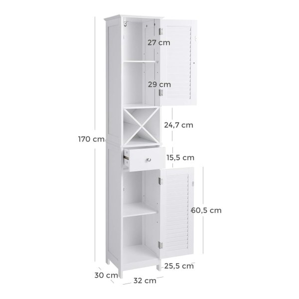 Badkamermeubel, hoge kast, badkamermeubel met 2 lamellen deuren, opbergkast met lade, uitneembare X vormige plank, Scandinavische stijl, wit