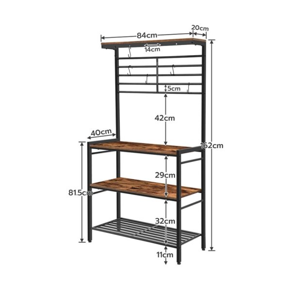 – Kleur: Rustiek Bruin – Materiaal: Spaanplaat en metaal- Grootte: 84 x 40 x 162 cm (l x b x h) – Gewicht: Max. Statische belastbaarheid van elke houten plank: 30 kg – Max. Statische belastbaarheid van metalen gaas plank: 20 kg – Max. Statische laadcapaciteit van elke haak: 3 kg – Max. Statische belastbaarheid van bovenste smalle plank: kg