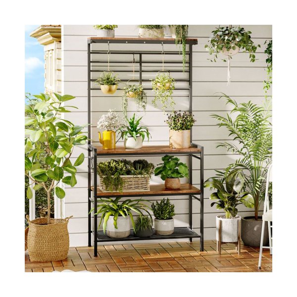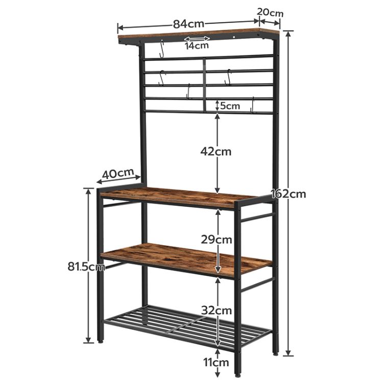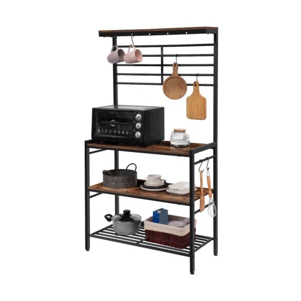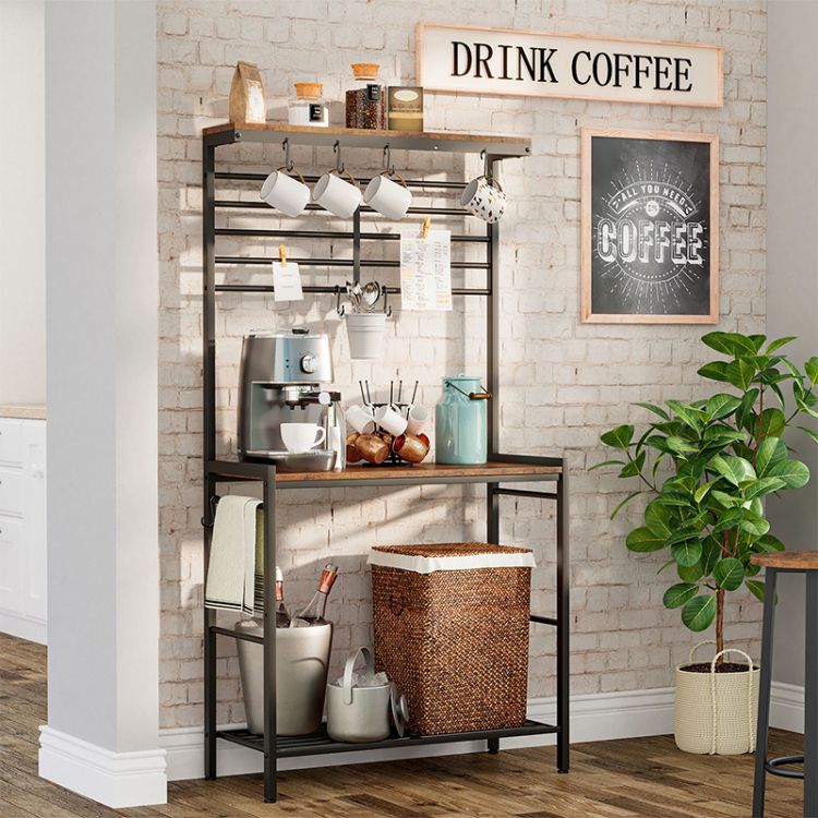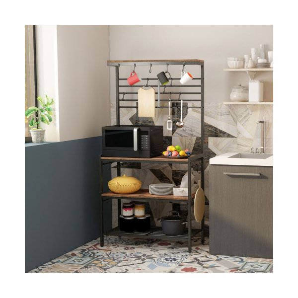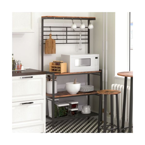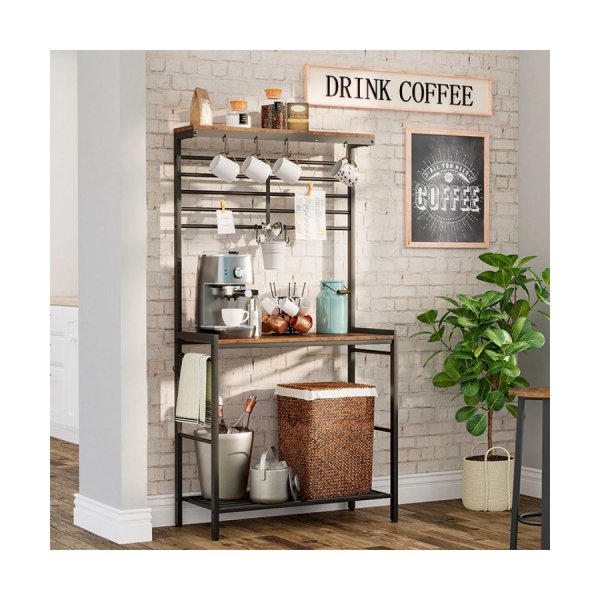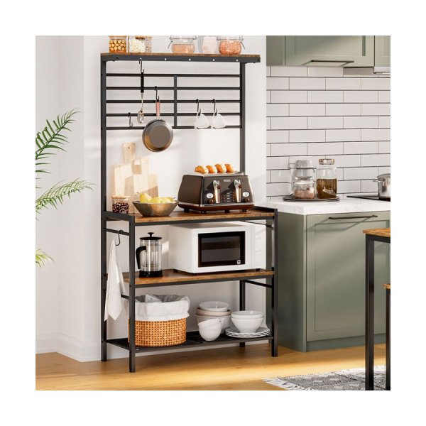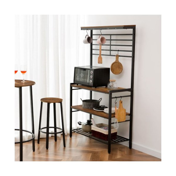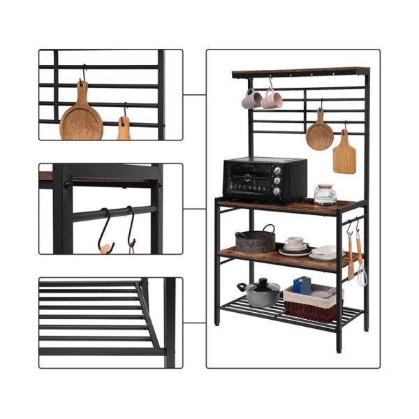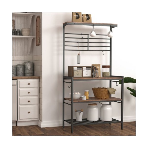 Bullet Point 3 | Koffiebalk, ovenrek, kookcentrum: laat uw verbeelding wild lopen.De bovenste decoratiekap is praktisch voor flessen of potplanten.Wijd en open werkstation biedt voldoende ruimte voor voedselbereiding.Zet broodroosters, ingeblikt voedsel, kruiden, borden in de planken.Plus, 6 S-vormige haken bevatten goed keukengadgets, waaronder handschoenen, pollepels, mokken |