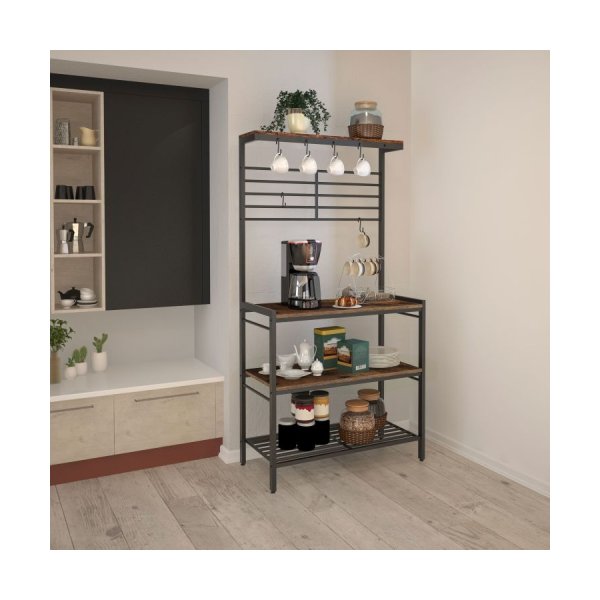 Bakersrek, magnetronstandaard, keukenopslagplankrek met haken, koffiebar, 4 planken en maaspaneel, verstelbare voeten, voor keuken, woonkamer, koffiestation, rustiek bruin