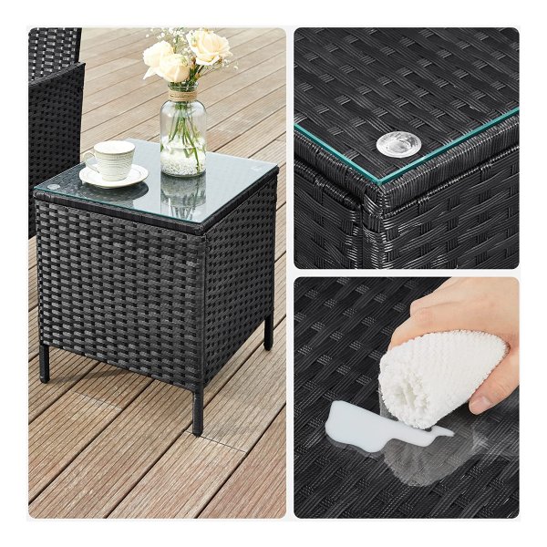 Stijlvol buitenleven: de eenvoudige look en de massieve metalen poten benadrukken de moderne charme van deze tuinmeubelset. Het PE-rotan oppervlak geeft je zomertuin een uitnodigend tintje De montage is een fluitje van een cent. Je hoeft niet moeizaam naar de juiste schroef te zoeken, want wij leveren schroeven in uniforme grootte. De nauwkeurig geboorde gaten en de duidelijke handleiding helpen je om de meubels moeiteloos op te bouwen Kwaliteit tot in het detail: de bijzettafel heeft een robuuste hardglasplaat. Dankzij het stabiele metalen frame en het weerbestendige polyrotan van polyrotan zullen deze balkonmeubels je vele jaren begeleiden Pure comfort: goed gevoerde zitkussens (5 cm dik) en ergonomisch gevormde rugleuningen zorgen voor een aangename zitervaring. Hoppla! Heb je iets gemorst? De afneembare kussenslopen en het glazen tafelblad zijn gemakkelijk schoon te maken: zorg adé! Breng ontspannen momenten door… in je tuin, op je balkon, op je terras of waar je ook een plek om zich terug te trekken creëert. Misschien ontbreekt je naast het zwembad een zitgedeelte om te cocktailen? Deze set past perfecProductdetails: Kleur: Zwart-taupe Materiaal van de stoel en tafel: Frame van verzinkt metaal, PE-polyrotan, gehard glas, Materiaal van de kussens: VFT-bekleding (Vertical Fibre Technology), bekleding van polyesterweefsel Afmetingen stoel: 56,5 x 54,5 x 81,5 cm (l x b x h) Afmetingen tafel: 40 x 40 x 45,5 cm (l x b x h) Totaal gewicht: 16,3 kg Maximale Statische belastbaarheid per stoel: 150 kg Maximale Statische belastbaarheid van de tafel: 30 kg