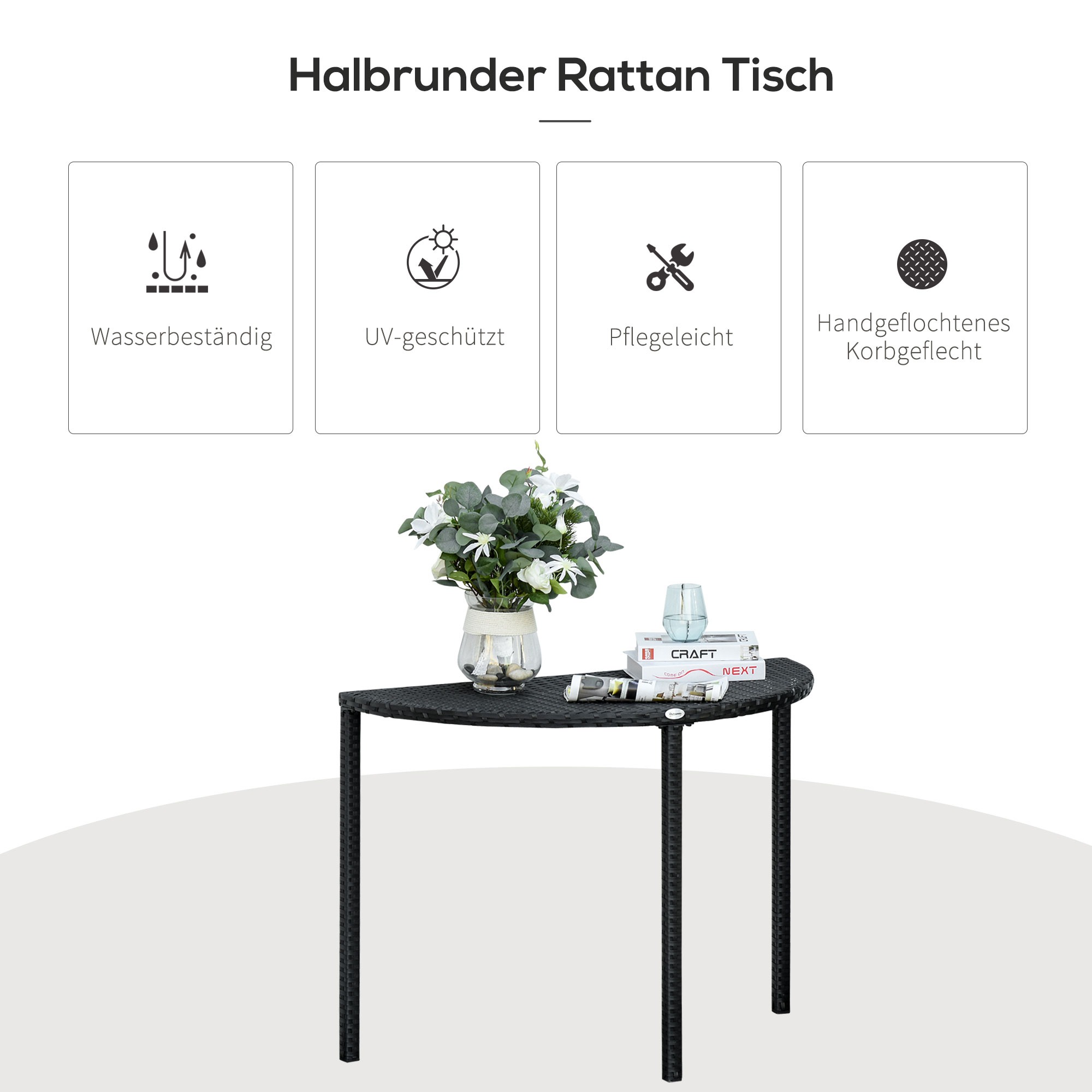 | Bullet Point 4 | De montage van de tafel is eenvoudig en het product zorgt voor flexibiliteit in gebruik. De balkontafel van polyrattan van Outsunny is zeer weerbestendig en geschikt voor buitengebruik op het balkon, in de tuin of op het terras. Met stevige metalen poten blijft de tafel zelfs met drie poten stabiel en draagbaar. Door het compacte formaat is de tafel gemakkelijk te verplaatsen en flexibel inzetbaar. De tafel heeft een modern design, een gemakkelijk schoon te maken oppervlak en is een ideale aanvulling op de rattanzithoek. Het maximaal draagvermogen is 75 kg. De technische gegevens zijn als volgt: Materiaal: Polyrattan, metaal, Kleur: Zwart, Afmetingen: 100L x 50B x 74H cm. De verpakking bevat 1 balkontafel. |
