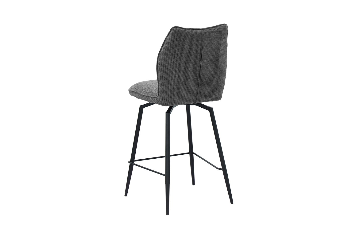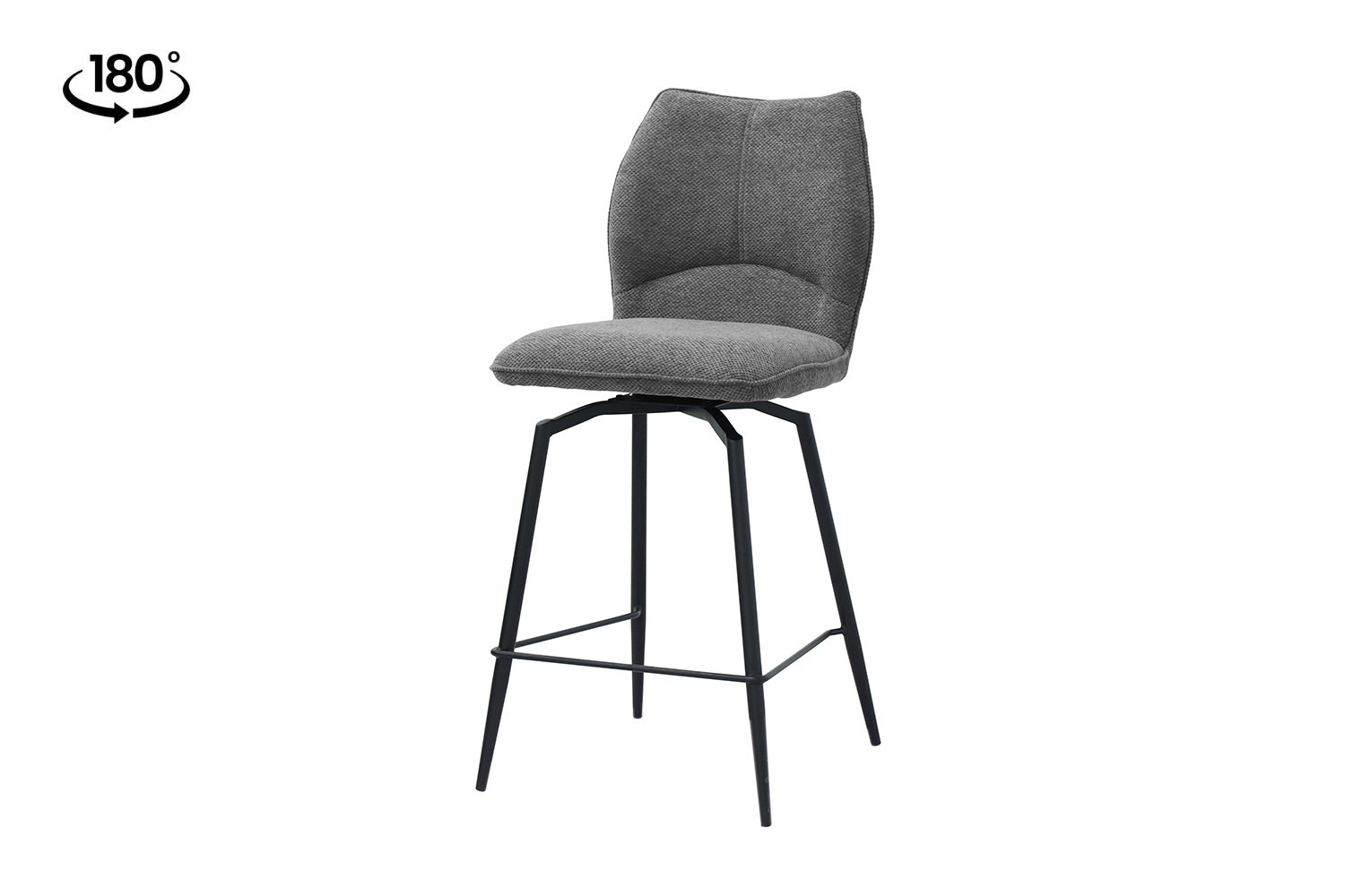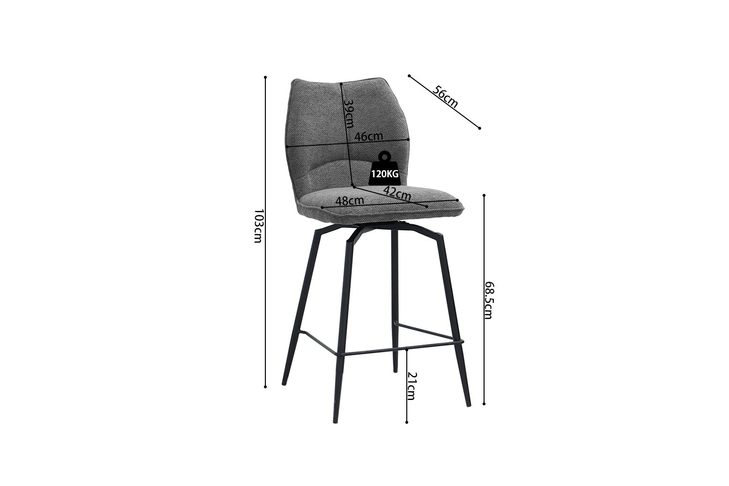Stijlvolle draaibare barkruk Lara in grijs met stoffen bekleding. Afmetingen van 103 x 48 x 56 cm. Perfect voor aan de bar of aan een hoge tafel.