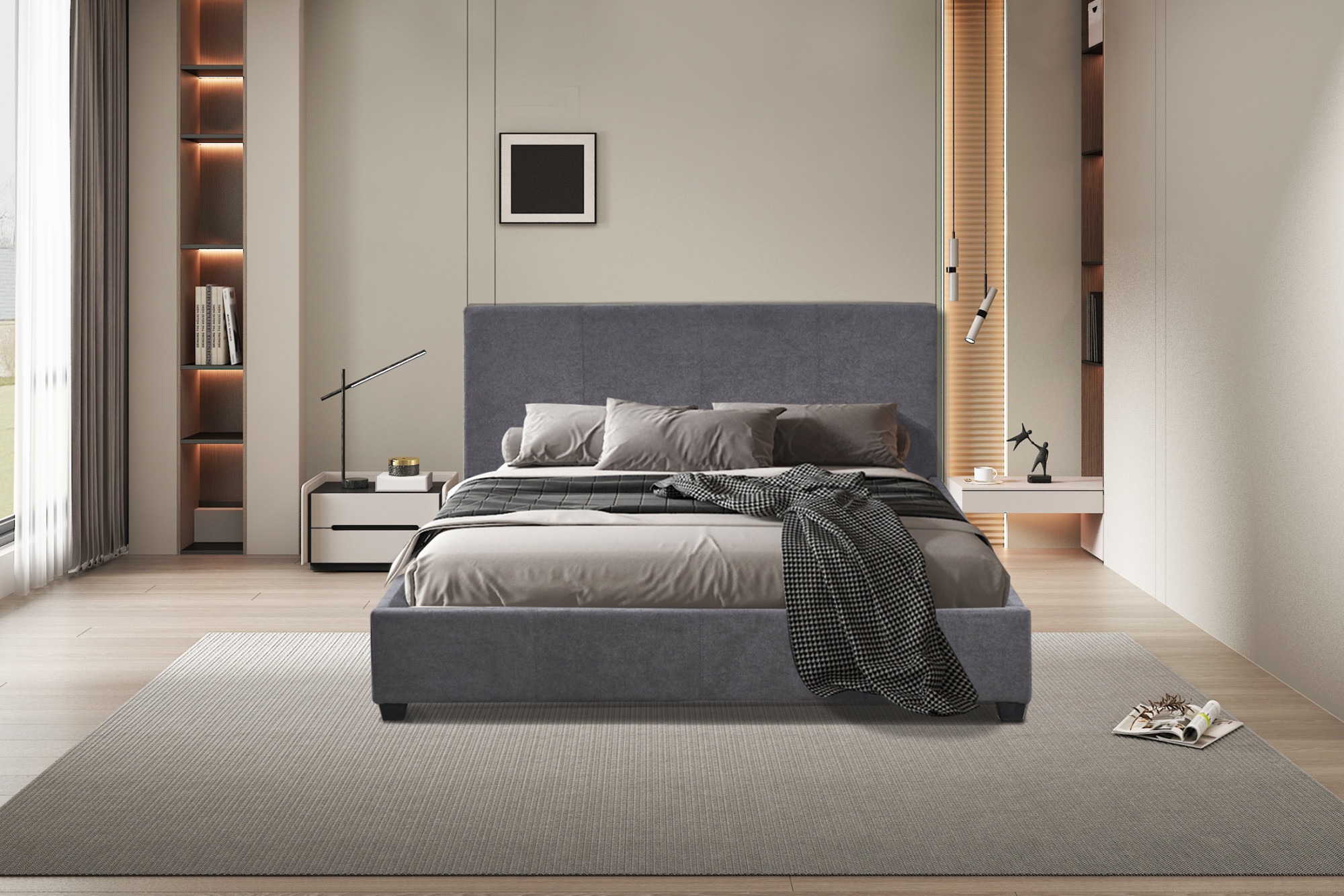 Gemaakt van hoogwaardige materialen die duurzaamheid en stijl combineren, trekt dit grijze bedframe direct de aandacht in de slaapkamer. De luxe stof geeft het bedframe een elegante uitstraling. De lattenbodem zorgt voor goede ondersteuning van het matras voor een comfortabele nachtrust.
