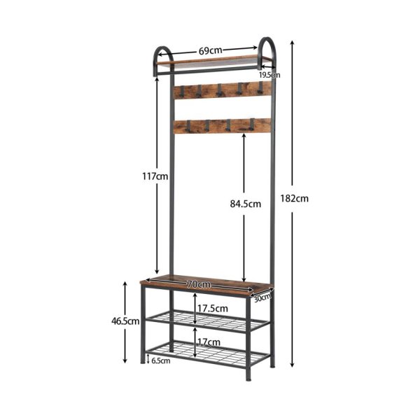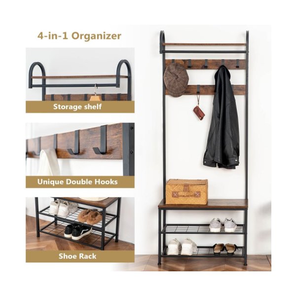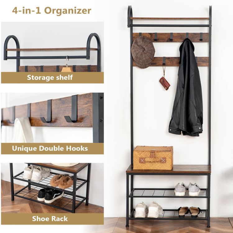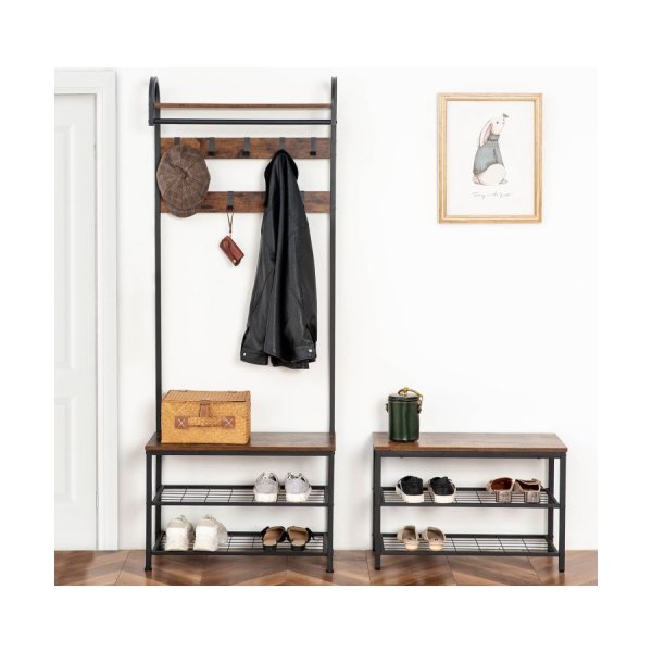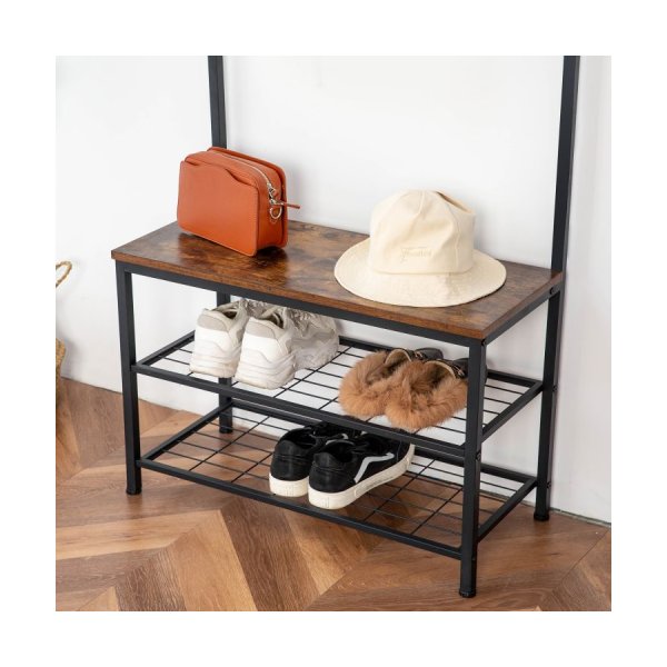 Bekijk rekschoenbank, halboom met bank en schoenopslag, halboom met opbergplank, 5 in 1 ontwerp, industrieel accentmeubilair met metalen frame, gemakkelijke montage, rustiek bruin