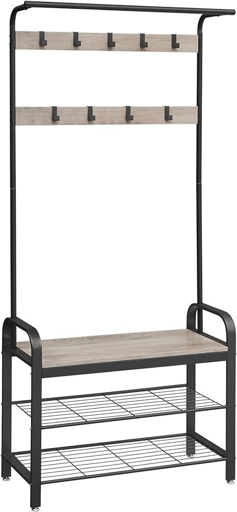Bekijkrek, kaprek, schoenrek met stoel, wasrek met 9 verwijderbare haken, bank, 2 maasbodems, 183 cm hoog, industrieel ontwerp, grijszwart