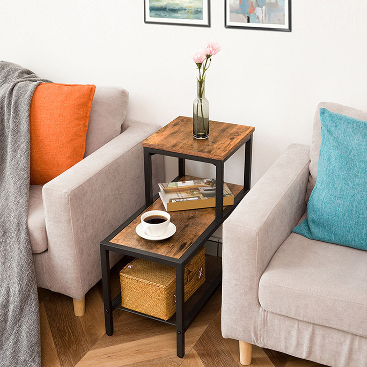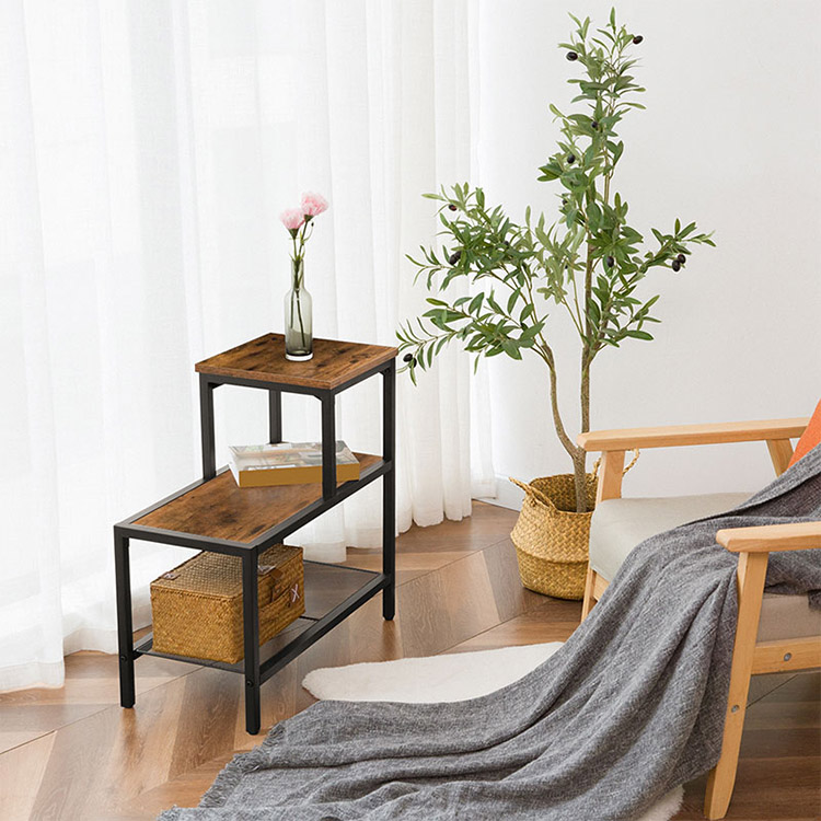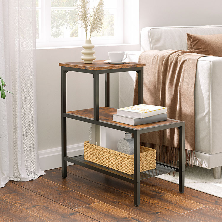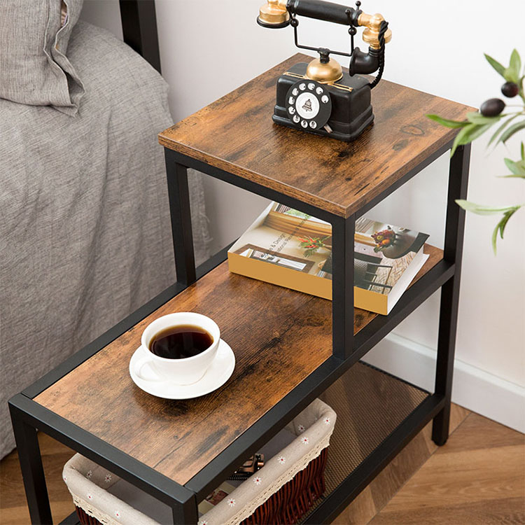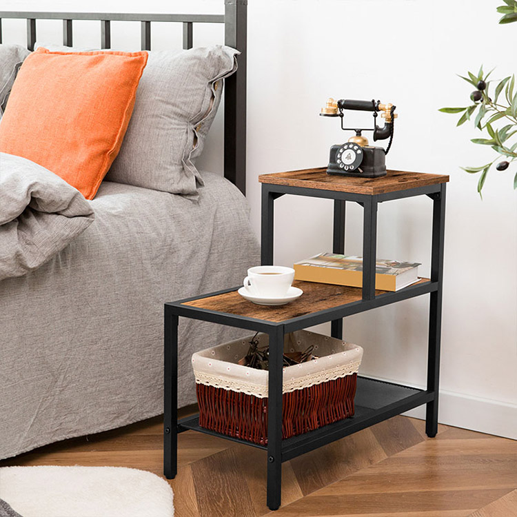 Bijzettafel, 3-laags smal nachtkastje met accent decoratieve ladderplank, industriële bank eindtafel voor kleine ruimte in woonkamer, slaapkamer, metalen frame, rustiek bruin en zwart