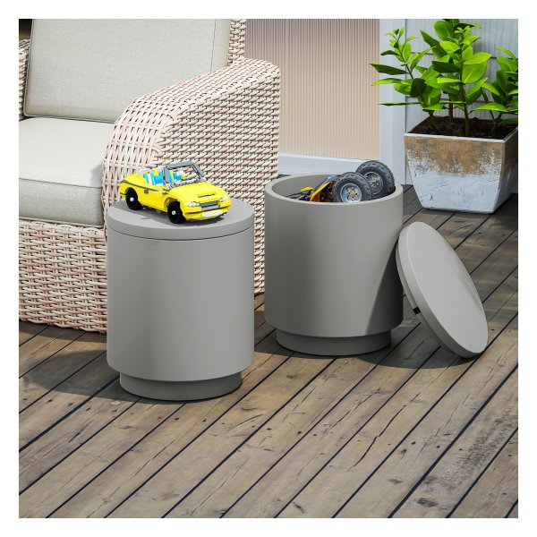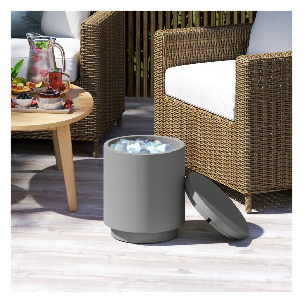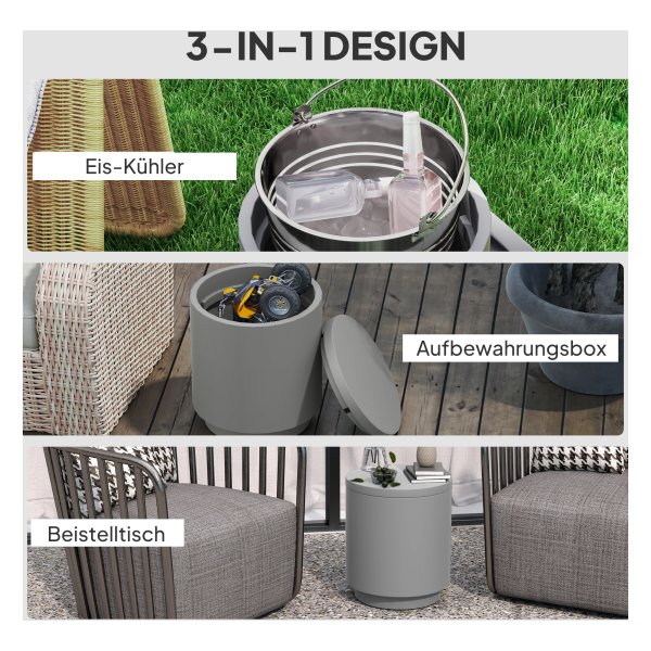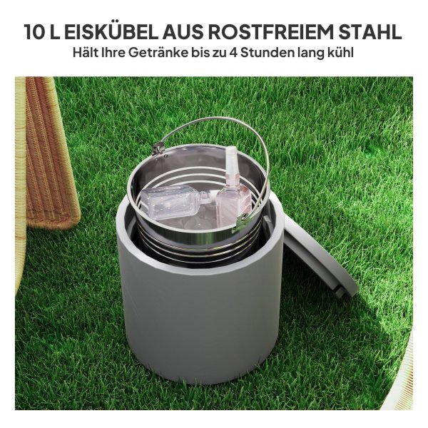 De HOMCOM bijzettafel is een multifunctioneel meubelstuk met een modern betonontwerp dat uw terras verfraait. Het kan dienen als koeler, opbergbox en tafel. Met een 10L roestvrijstalen emmer houdt het drankjes koel tot 4 uur.