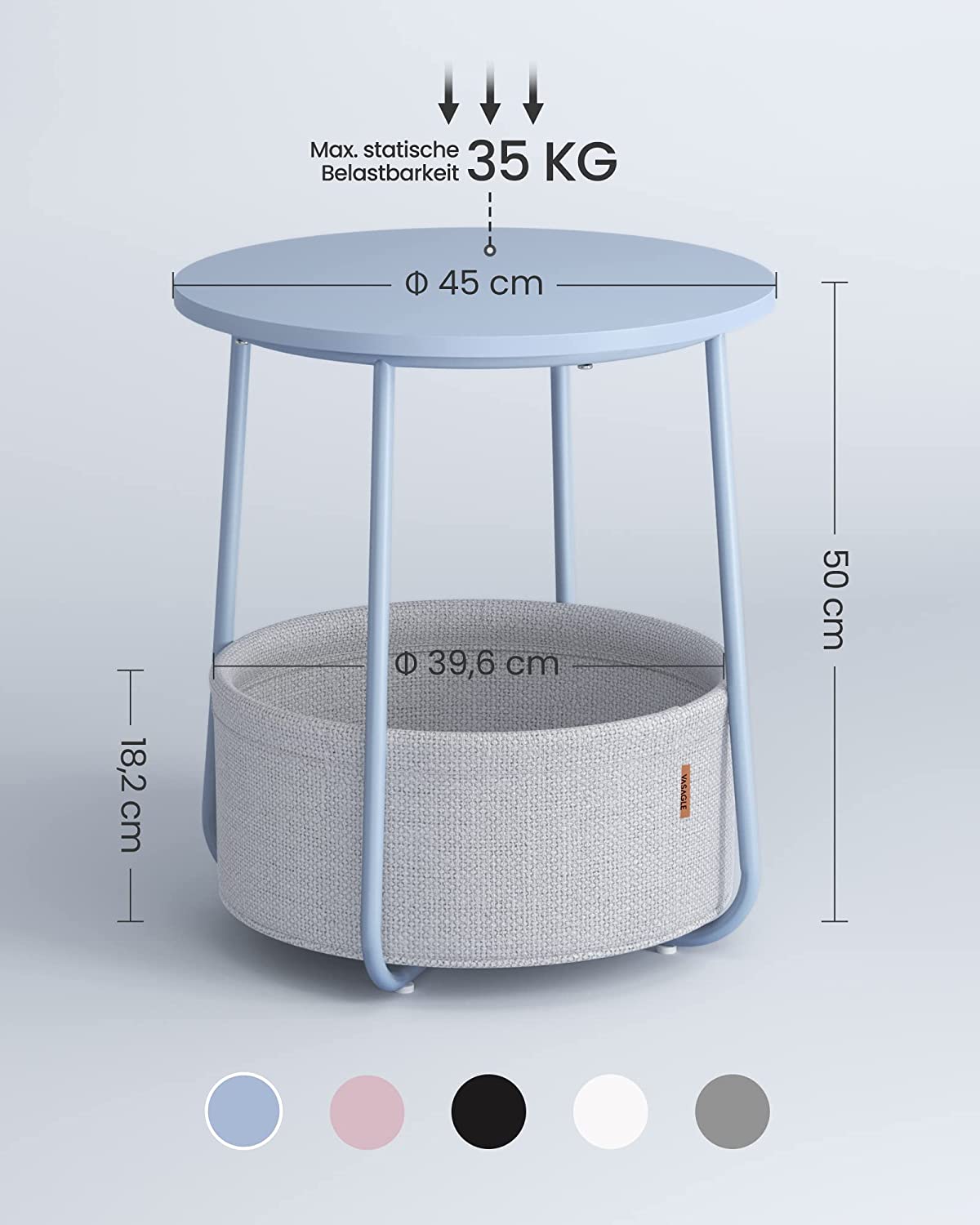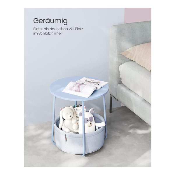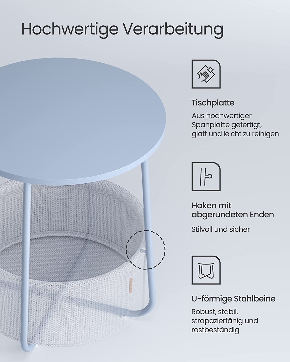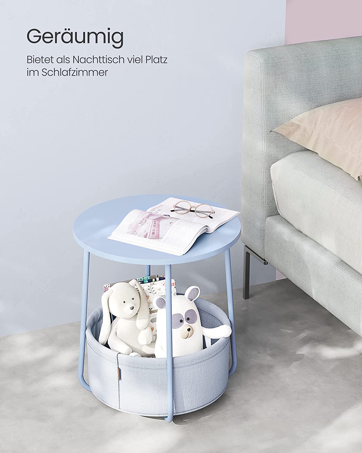 Bijzettafel Rond, Kleine Tafel, Salontafel Klein, Woonkamertafel Met Mand Van Stof, Opbergruimte Voor Woonkamer, Slaapkamer, Nachtkastje, Modern, Poederblauw-Pastelblauw