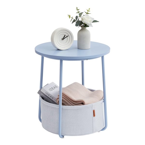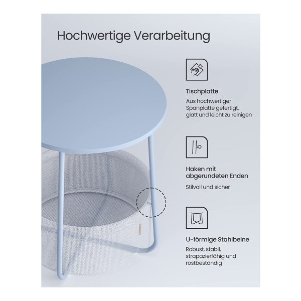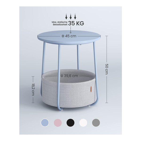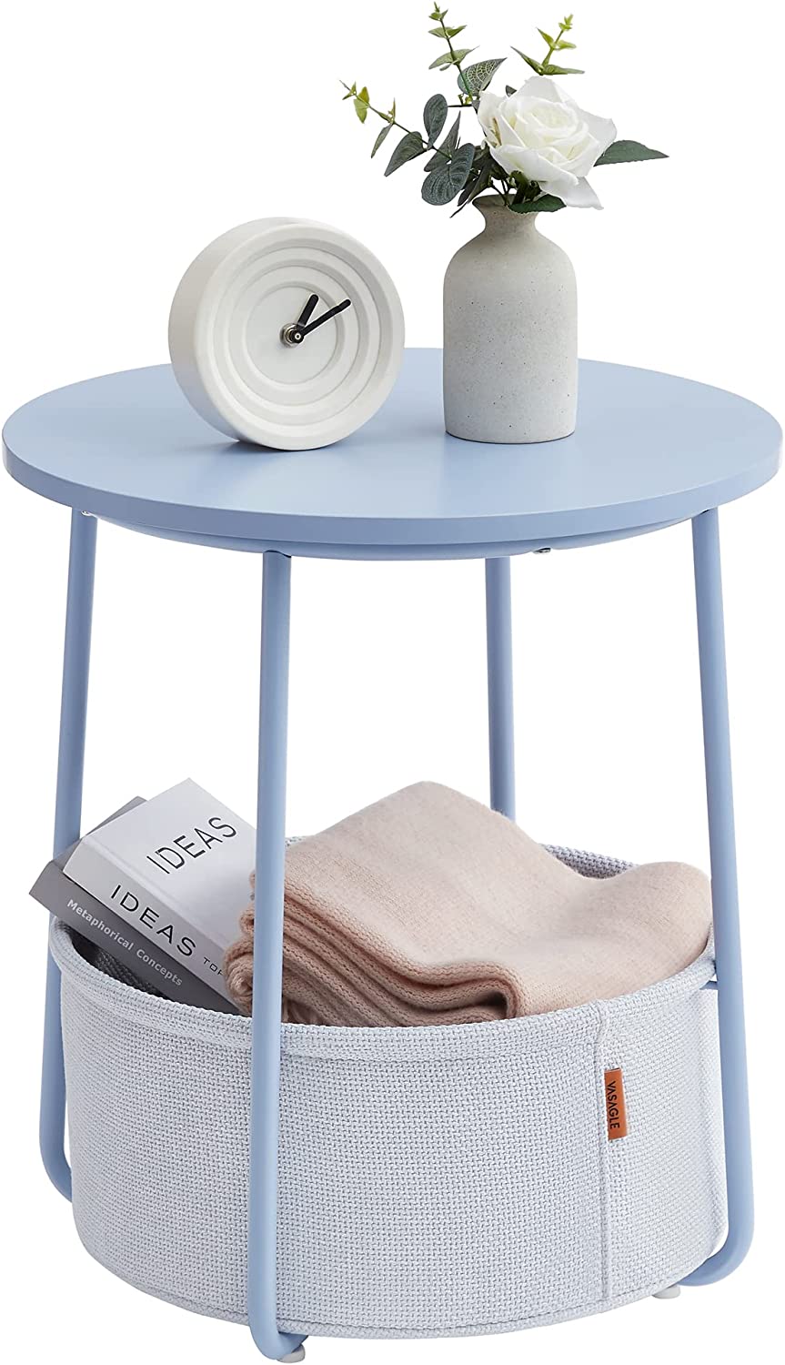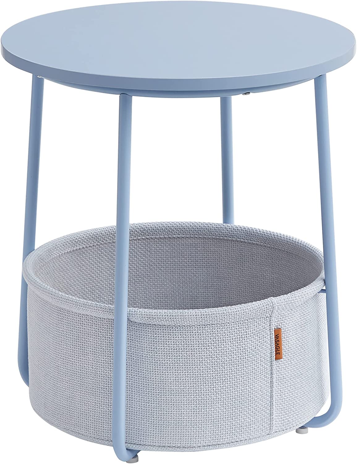 Bijzettafel Rond, Kleine Tafel, Salontafel Klein, Woonkamertafel Met Mand Van Stof, Opbergruimte Voor Woonkamer, Slaapkamer, Nachtkastje, Modern, Poederblauw-Pastelblauw