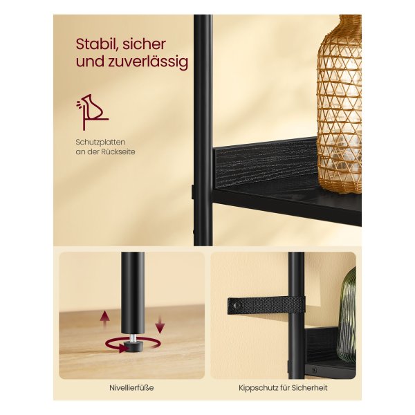 De TrendyLiving boekenkast is ontworpen met veiligheid en stabiliteit in gedachten. Verstelbare voetjes zorgen voor balans op oneffen vloeren, terwijl het anti-kantel systeem voorkomt dat de kast omvalt. De achterpanelen zorgen ervoor dat je spullen niet wegglijden.