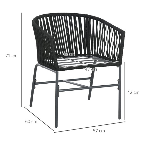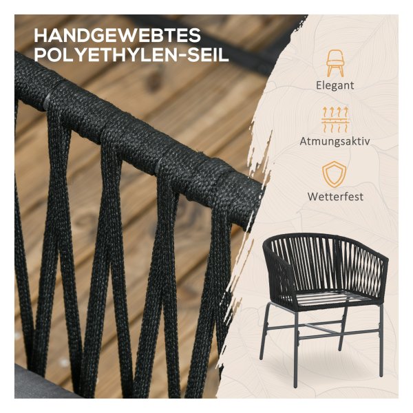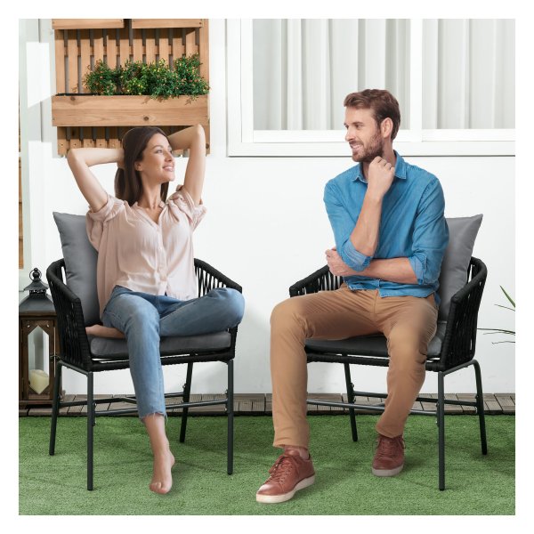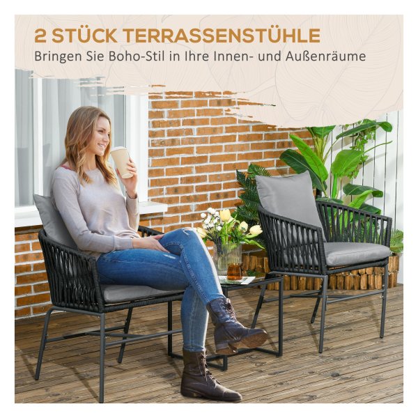 Bullet Point 2 | Breng een ontspannen middag door met deze elegante buitestoelen van Outsunny. Het handgevlochten ontwerp en slanke frame geven een vleugje elegantie, perfect voor zowel binnen als buiten. De zit- en rugkussens zorgen voor uitzonderlijk comfort. De stoelen hebben een Boho-uitstraling met een zitkuip die zich vormt naar je lichaam. Het stalen frame is gepoedercoat en heeft versterkte dwarsbalken voor stabiliteit. De stoelen hebben afneembare kussenhoezen en vereisen enige montage. |