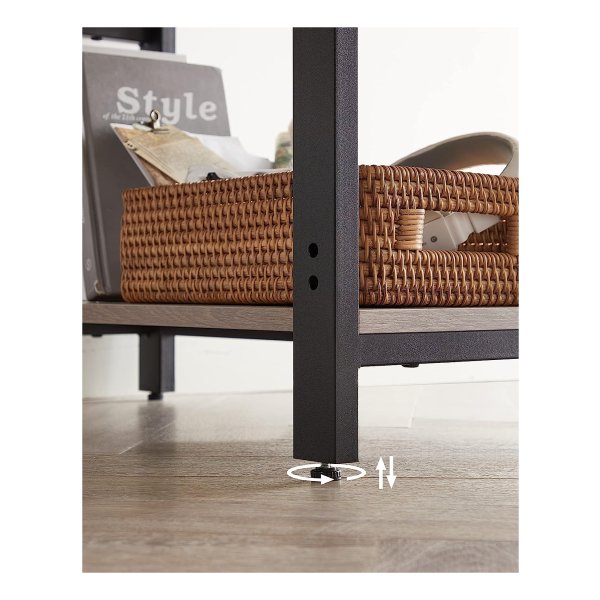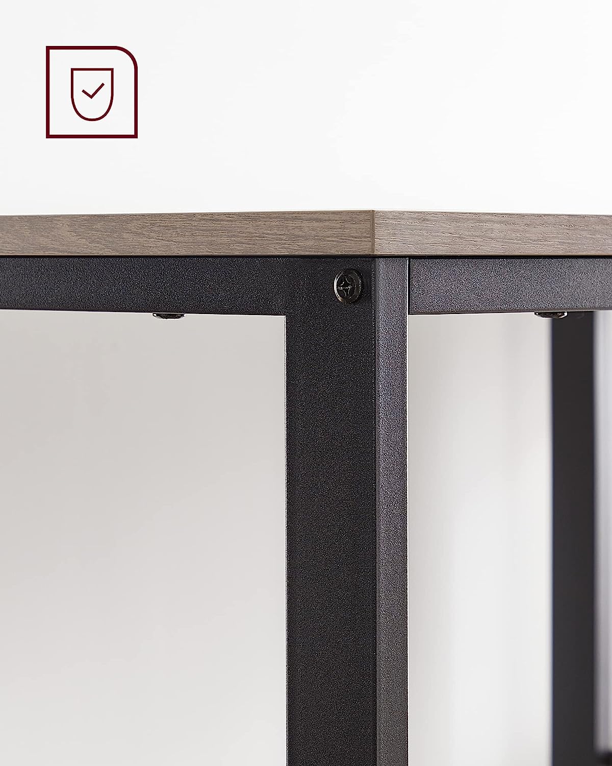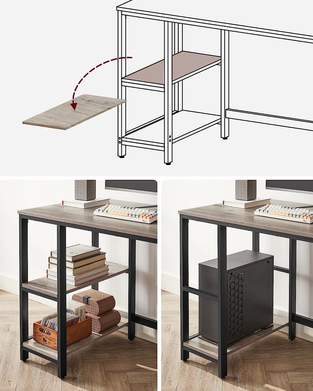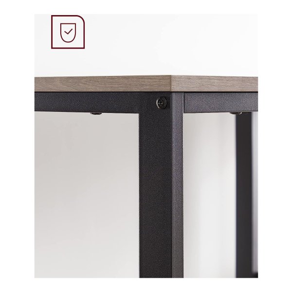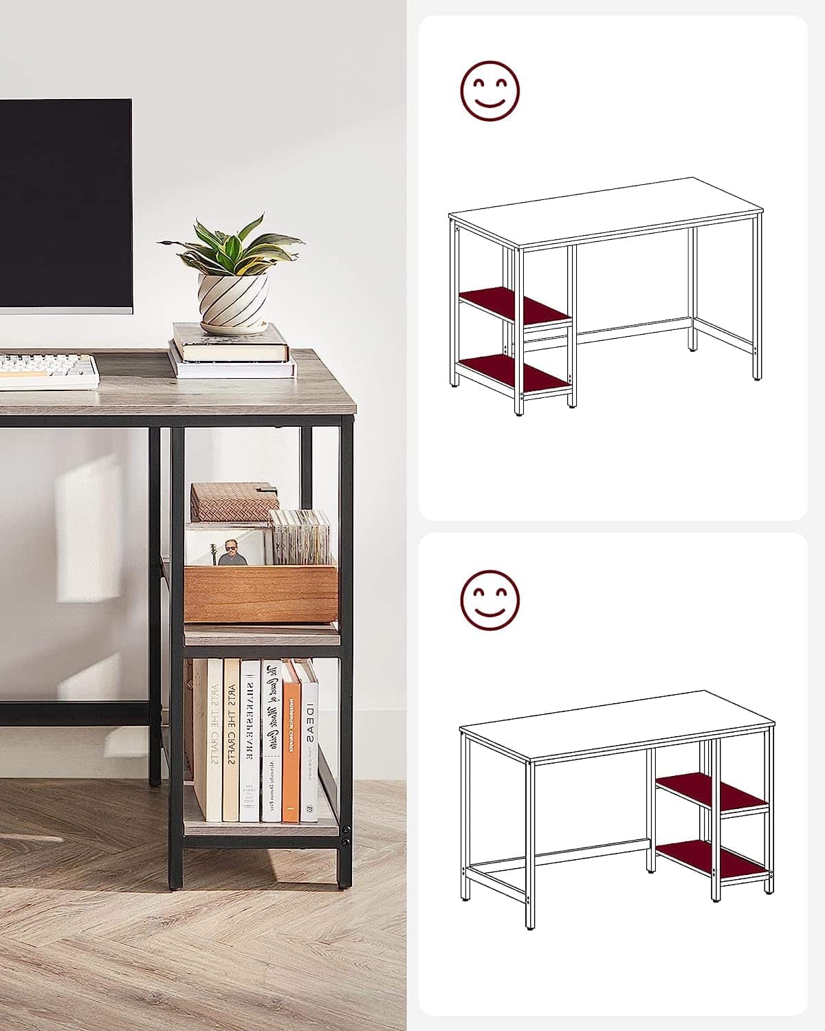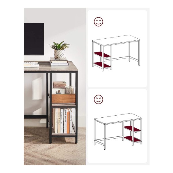 Deze stijlvolle bureau, computertafel, pc-tafel of bureautafel is perfect voor zowel kantoor als woonkamer. Het stalen frame heeft een industrieel design en is afgewerkt in een Greige-zwarte kleur. De tafel heeft twee planken aan de rechter- of linkerkant, waardoor je al je kantoorbenodigdheden netjes kunt opbergen.