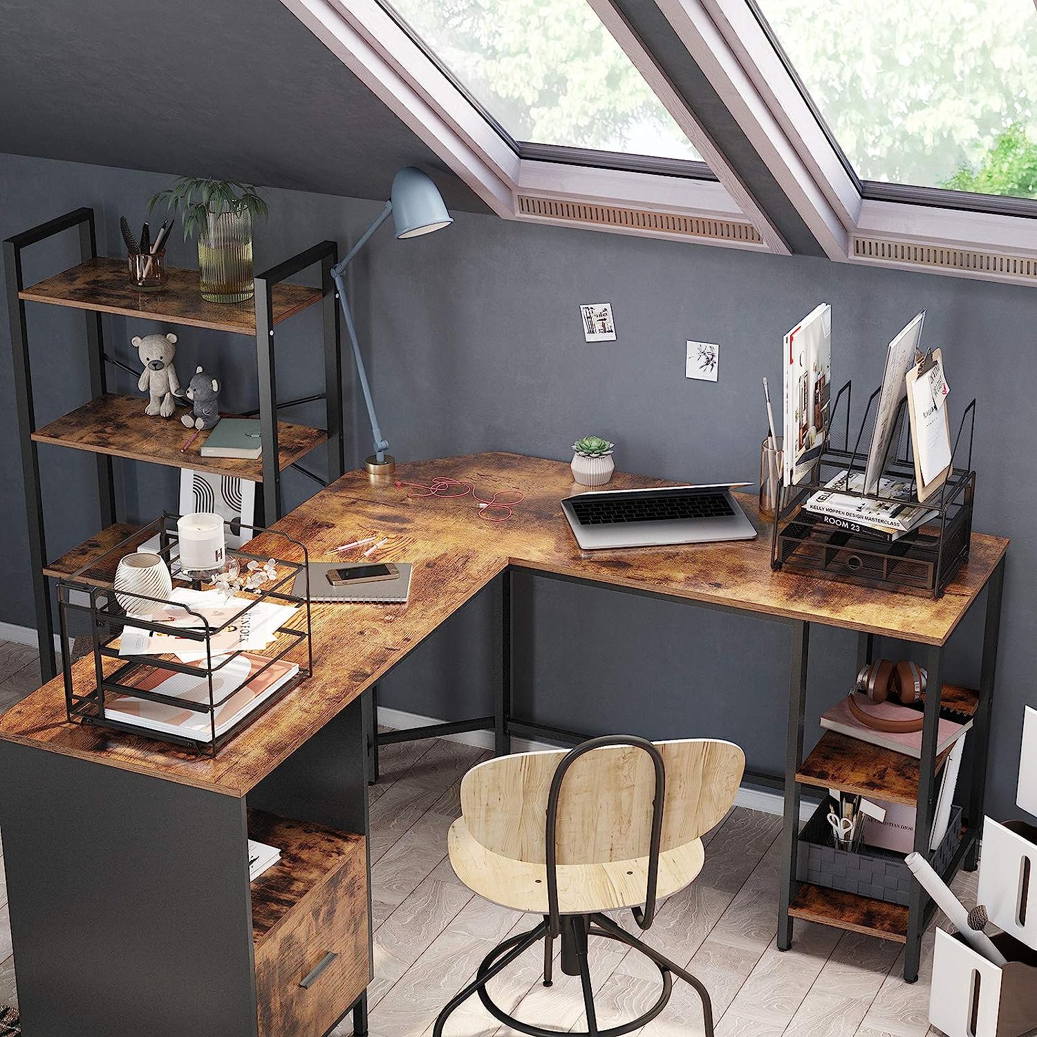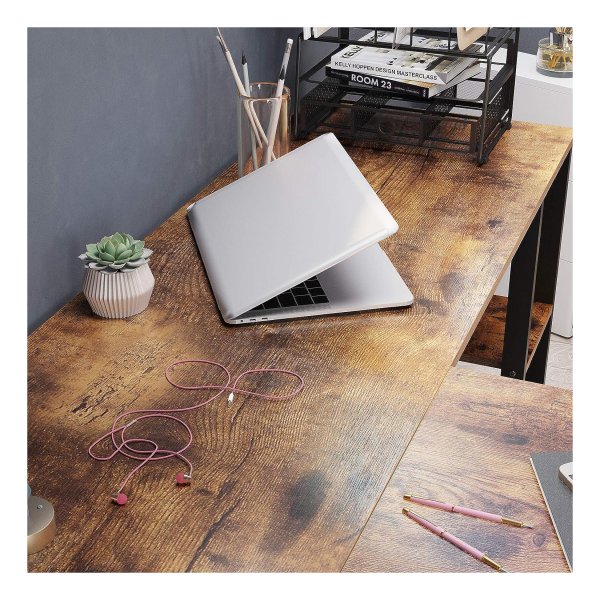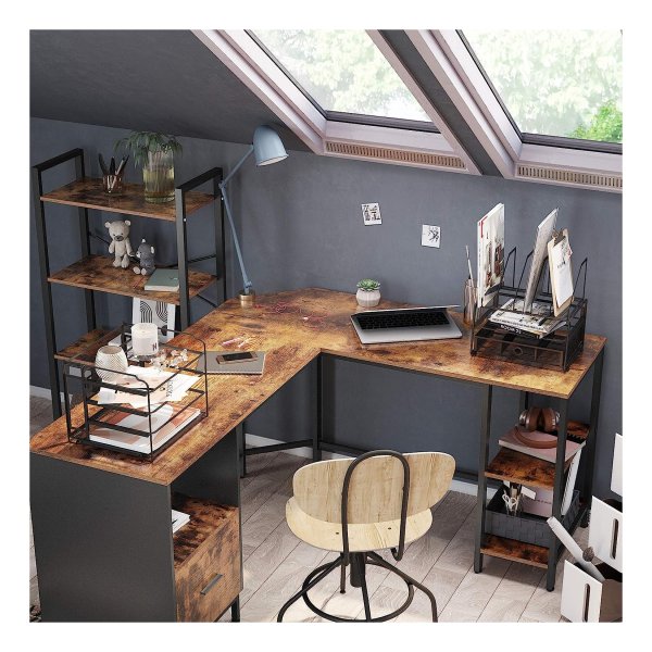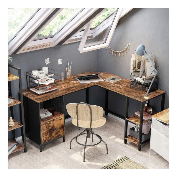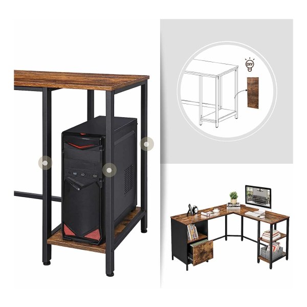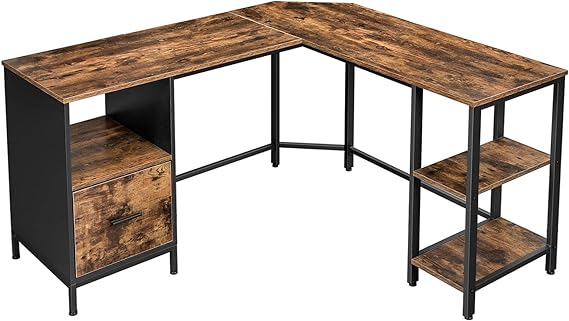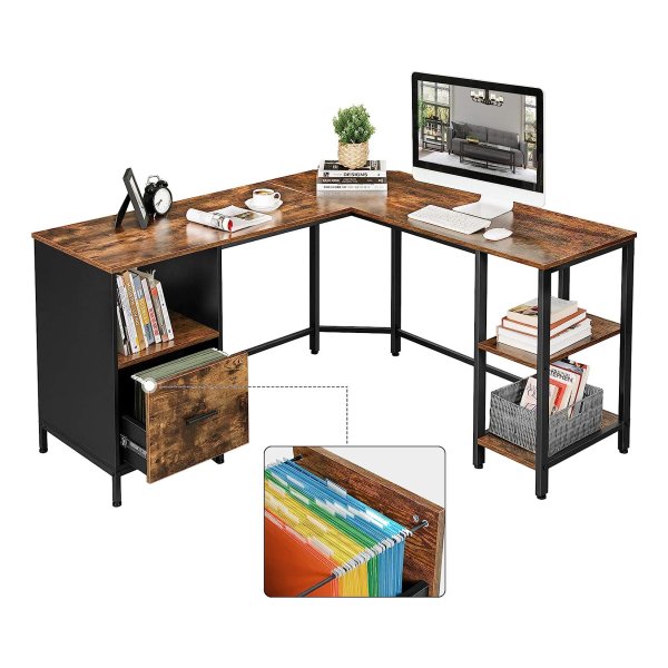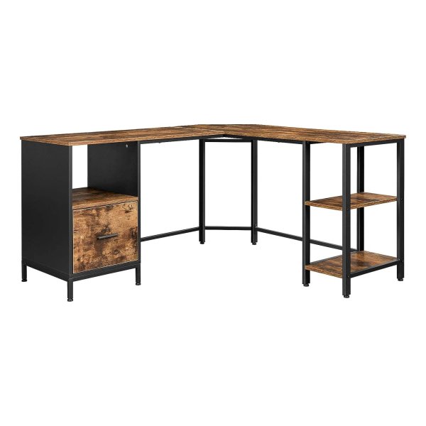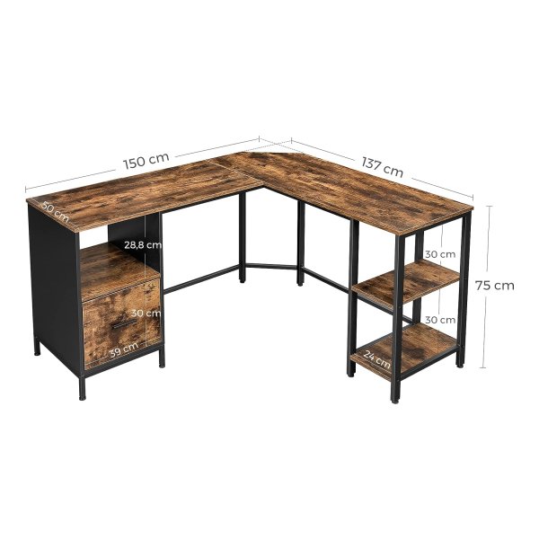 bureau L-vormige computerbureau met kast- en suspensiemapkast, 2 planken, 150 x 137 x 75 cm, vintage bruinzwarte LWD75X