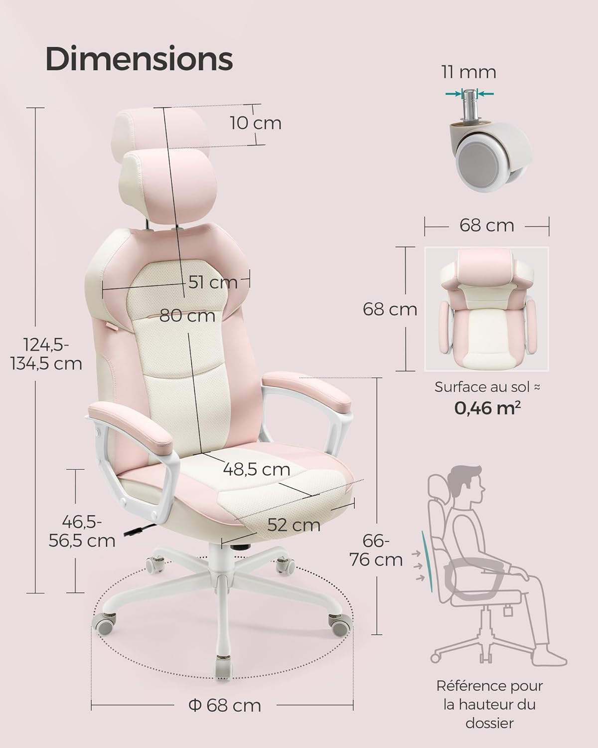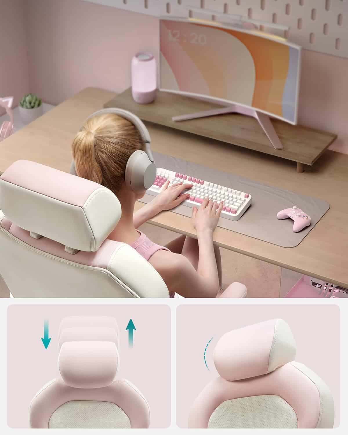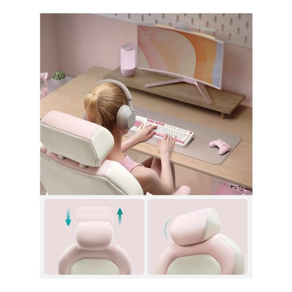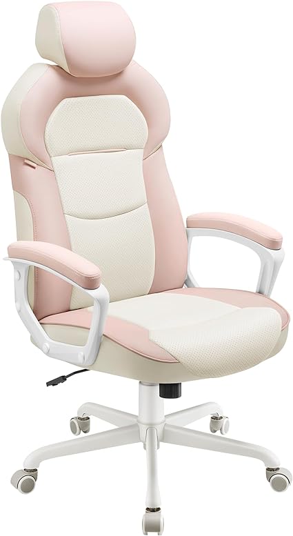 Bureaustoel, bureaustoel, computerstoel, PU, verstelbare hoofdsteun, gevoerde armleuningen, kantelfunctie, tot 150 kg belastbaar, pastelroze
