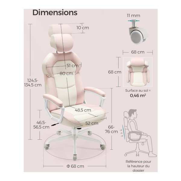 Bullet Point 1 | Op meerdere plaatsen verstelbaar: de zithoogte is instelbaar tussen 46,5 – 56,5 cm; de verstelbare hoofdsteun biedt optimale grip voor nek en hoofd, geschikt voor gebruikers met een lichaamslengte van 170-190 cm; 95-110 graden kantelfunctie voor ontspanning |
