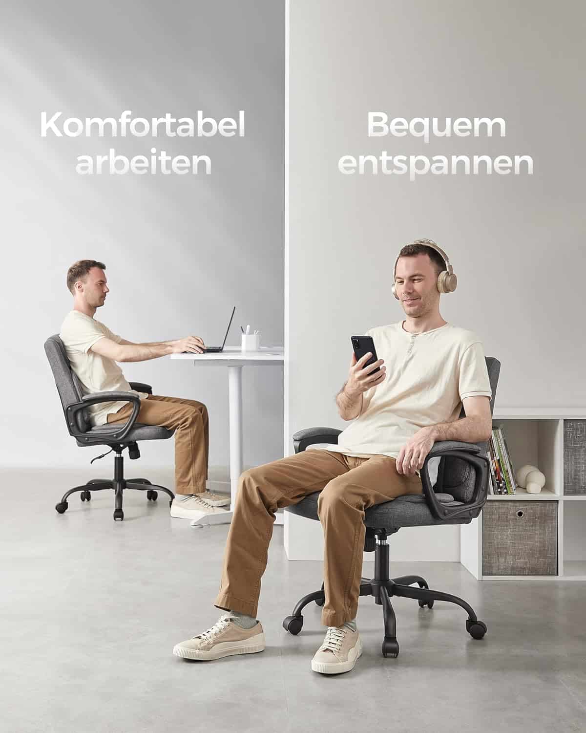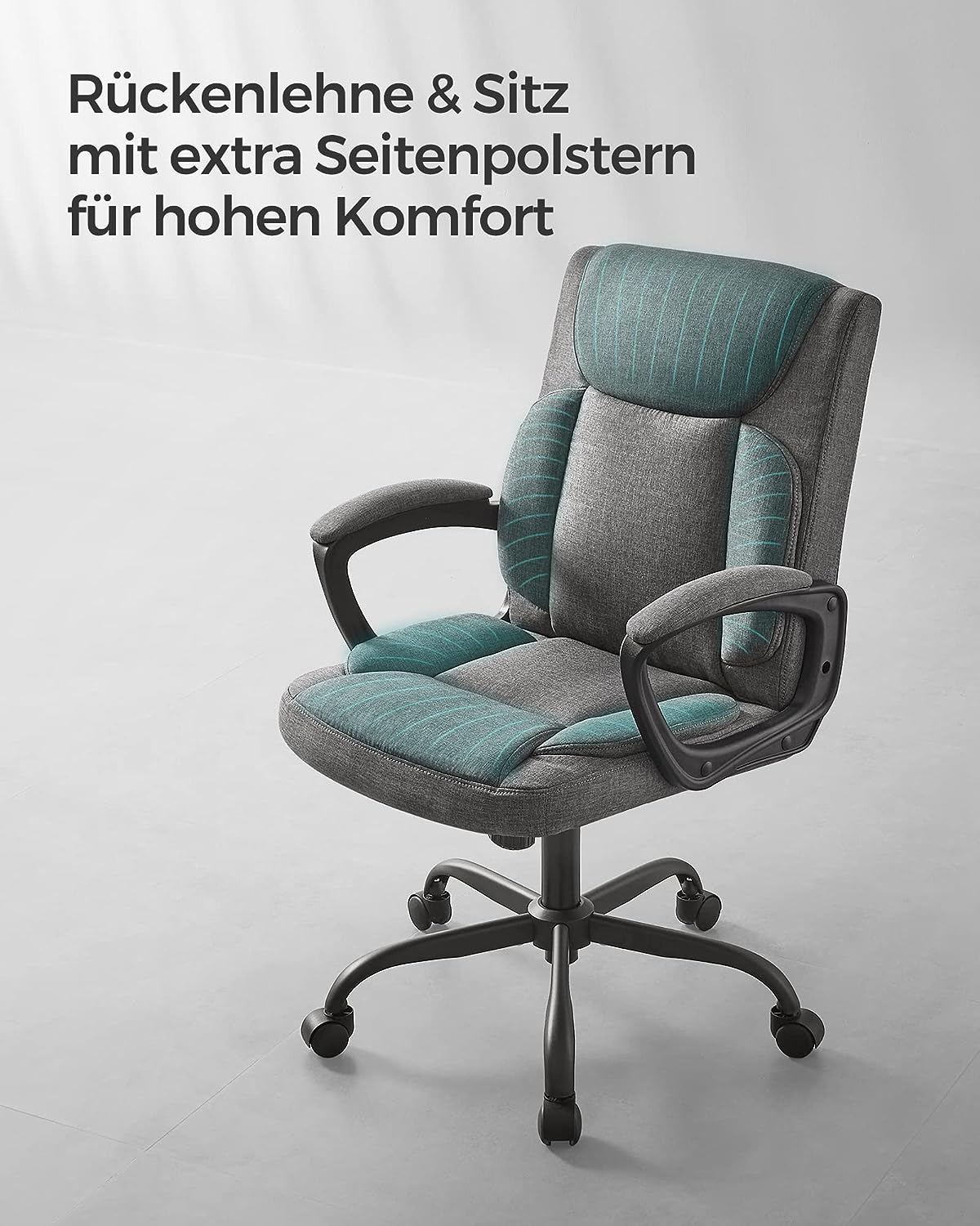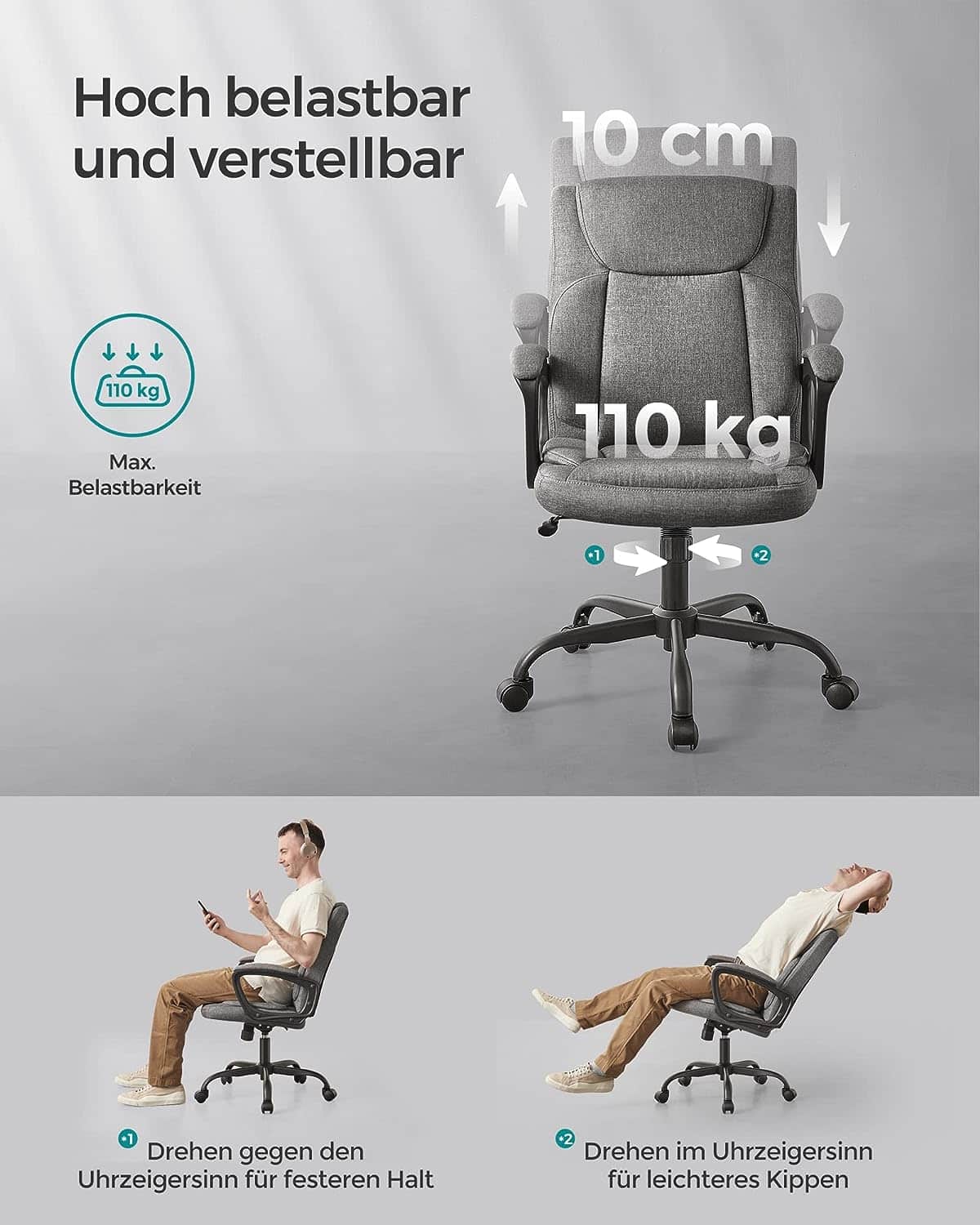 Bureaustoel, computerstoel, ergonomische draaistoel, kantelfunctie, in hoogte verstelbaar, gevoerde armleuningen, katoenmix, grijs
