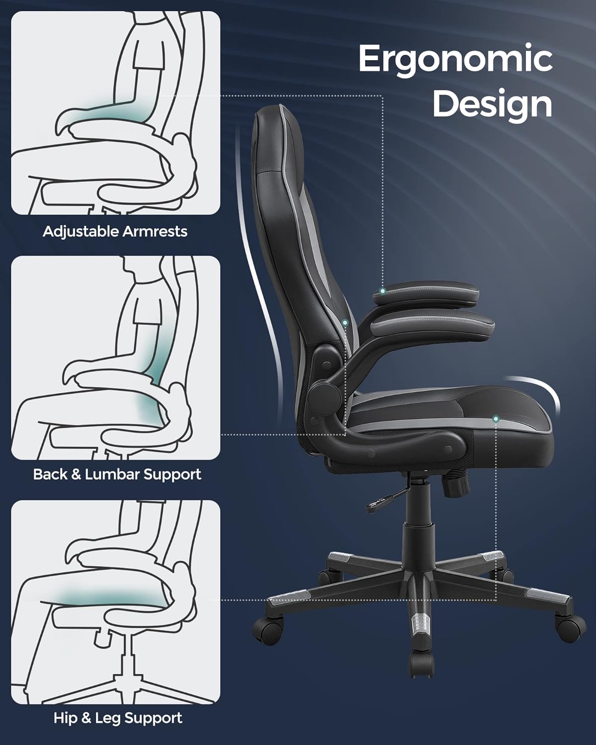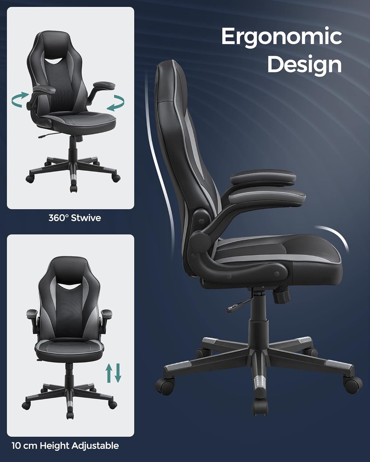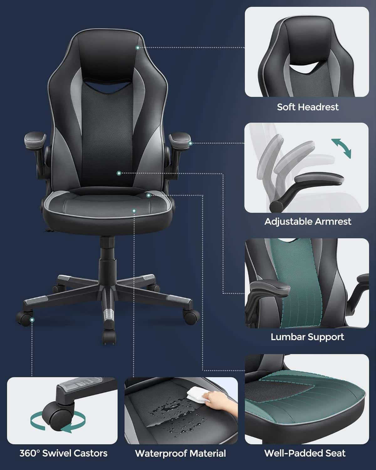 Bureaustoel, ergonomische bureaustoel, computerstoel, in hoogte verstelbaar, belastbaar tot 150 kg, PU imitatieleer, kantoor, thuis, kantoor, zwart en grijs