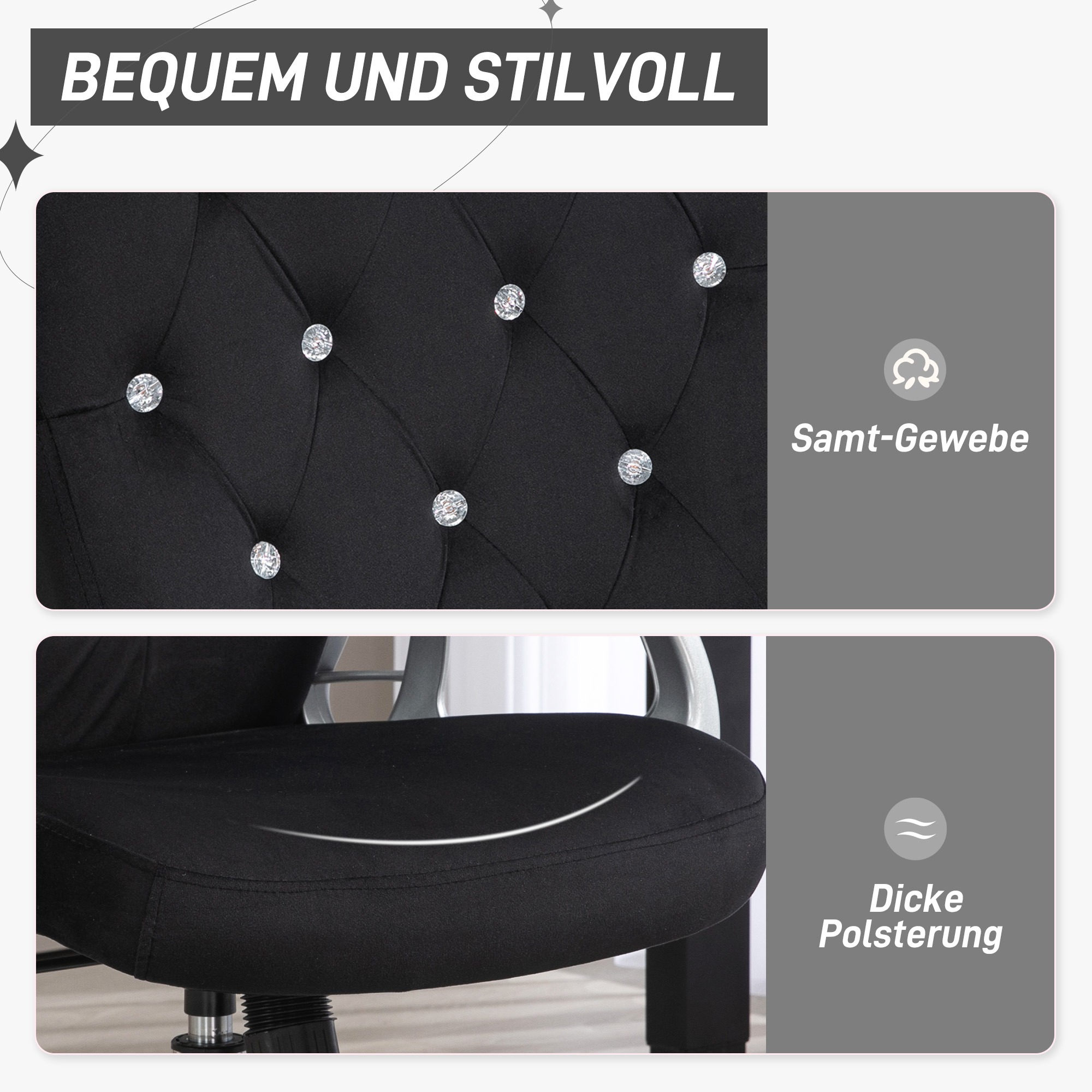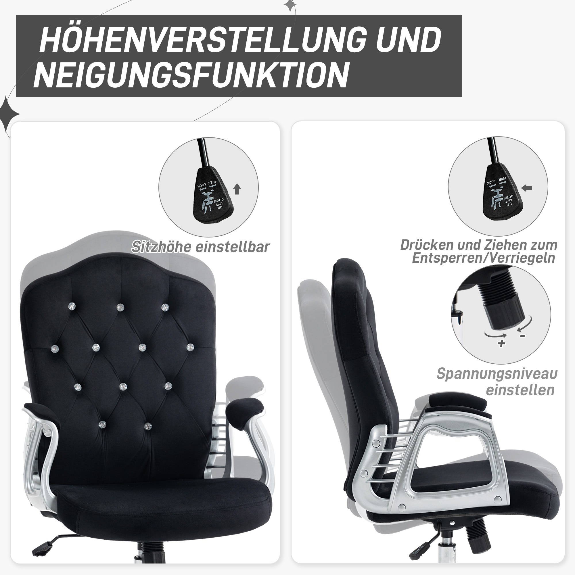 | Bullet Point 1 | Het ontwerp van de Vinsetto bureaustoel omarmt uw behoeften door stevige ondersteuning te bieden met extra dik kussen en een luxueus ligmechanisme, terwijl het fluweelachtige oppervlak en sprankelende kristalknoppen zorgen voor comfort en een vleugje elegantie tijdens die lange werkdagen. |