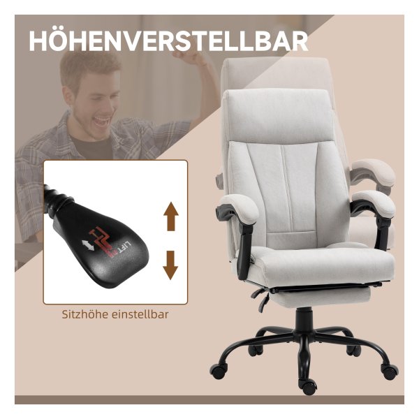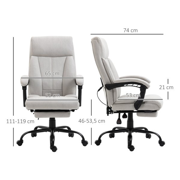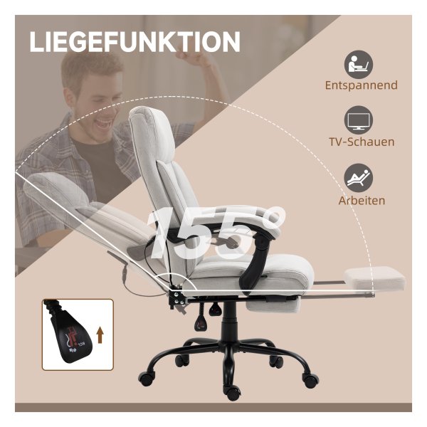 | Bullet Point 4 | De bureaustoel van Vinsetto biedt een gemakkelijke montage dankzij de duidelijke handleiding die wordt meegeleverd. De flexibiliteit van het product wordt benadrukt door de zes vibratiemassagepunten met vijf modi en lendenverwarming, waardoor uw lichaam kan ontspannen. Daarnaast heeft de stoel een kantelhoek van 155 en een voetensteun om te kunnen ontspannen, en de gewatteerde rugleuning met gebogen vorm biedt extra ondersteuning. Verder is de zithoogte verstelbaar voor uw comfort en is de stoel voorzien van draaibare wielen voor eenvoudige mobiliteit. Juist door deze eigenschappen weet Vinsetto comfort en functionaliteit in deze bureaustoel goed te combineren. |