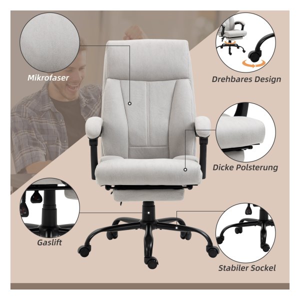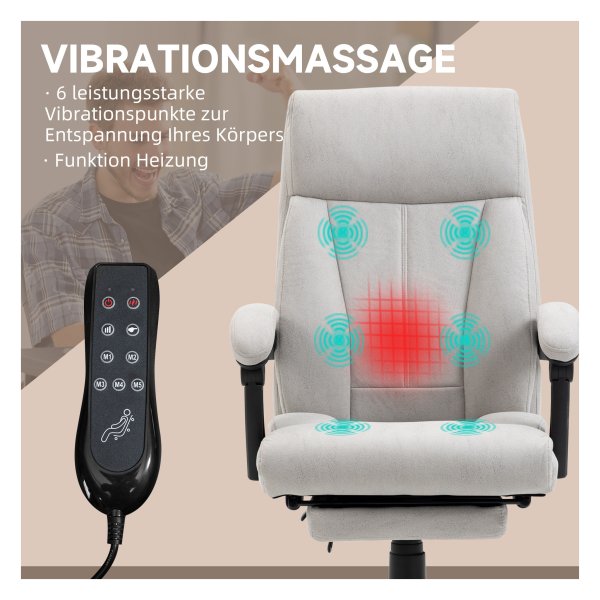 | Bullet Point 2 | De bureaustoel van Vinsetto biedt een combinatie van comfort en functionaliteit. Met zes vibratiemassagepunten, vijf massage modi en lendenverwarming helpt deze stoel om stress te verlichten. De verstelbare zithoogte en kantelfunctie zorgen voor extra gemak en ergonomie. Gemaakt van ademend microvezel, comfortabel schuim en stevig staal, biedt deze stoel duurzaamheid en ondersteuning. Met een modern ontwerp, draaibare wielen en een eenvoudige montage is deze stoel perfect voor een comfortabele en productieve werkomgeving. |