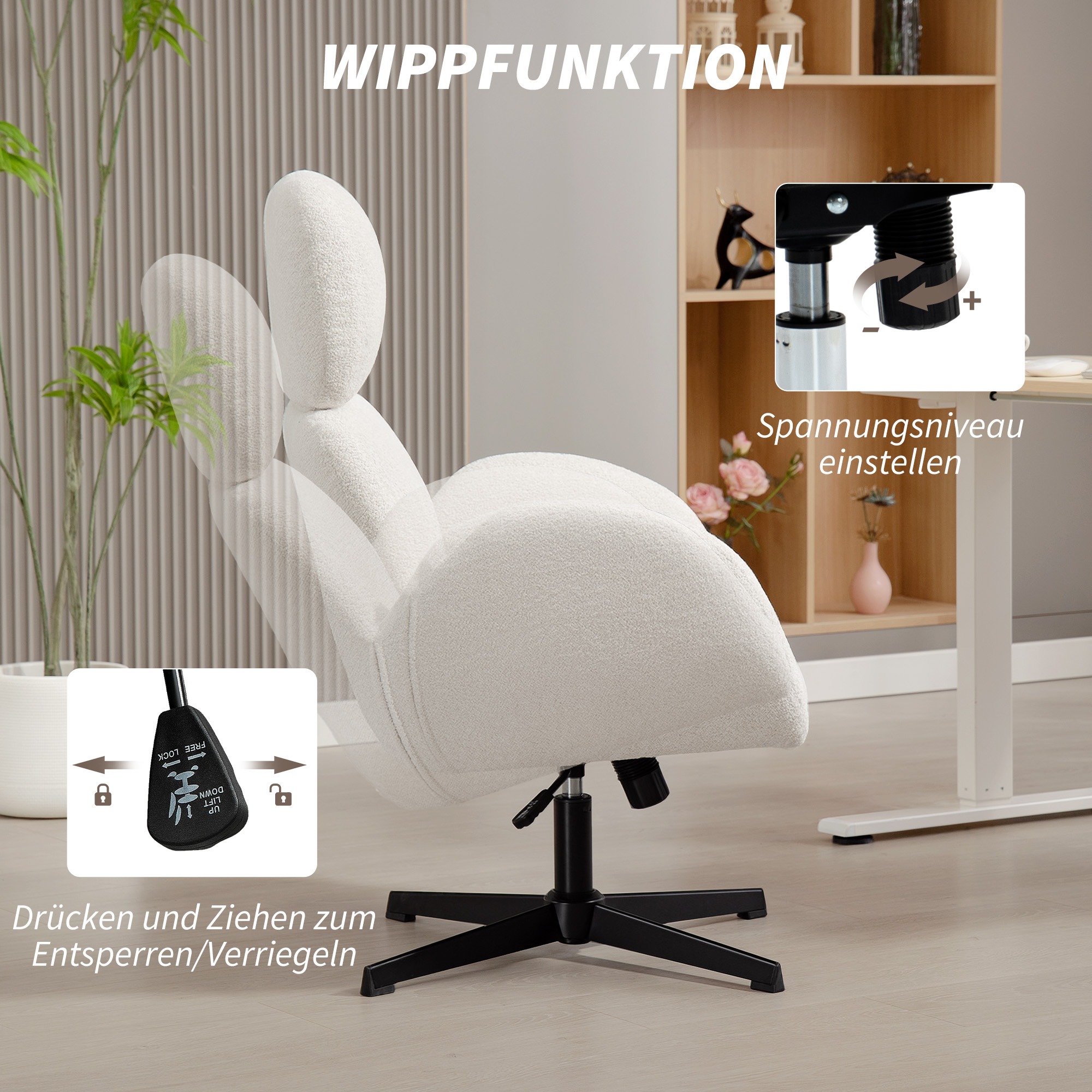 - Verstel de hoogte en kantelfunctie van de stoel om de perfecte positie te vinden voor werk of ontspanning, terwijl u profiteert van 360-graden mobiliteit en stabiliteit dankzij de robuuste basis.
