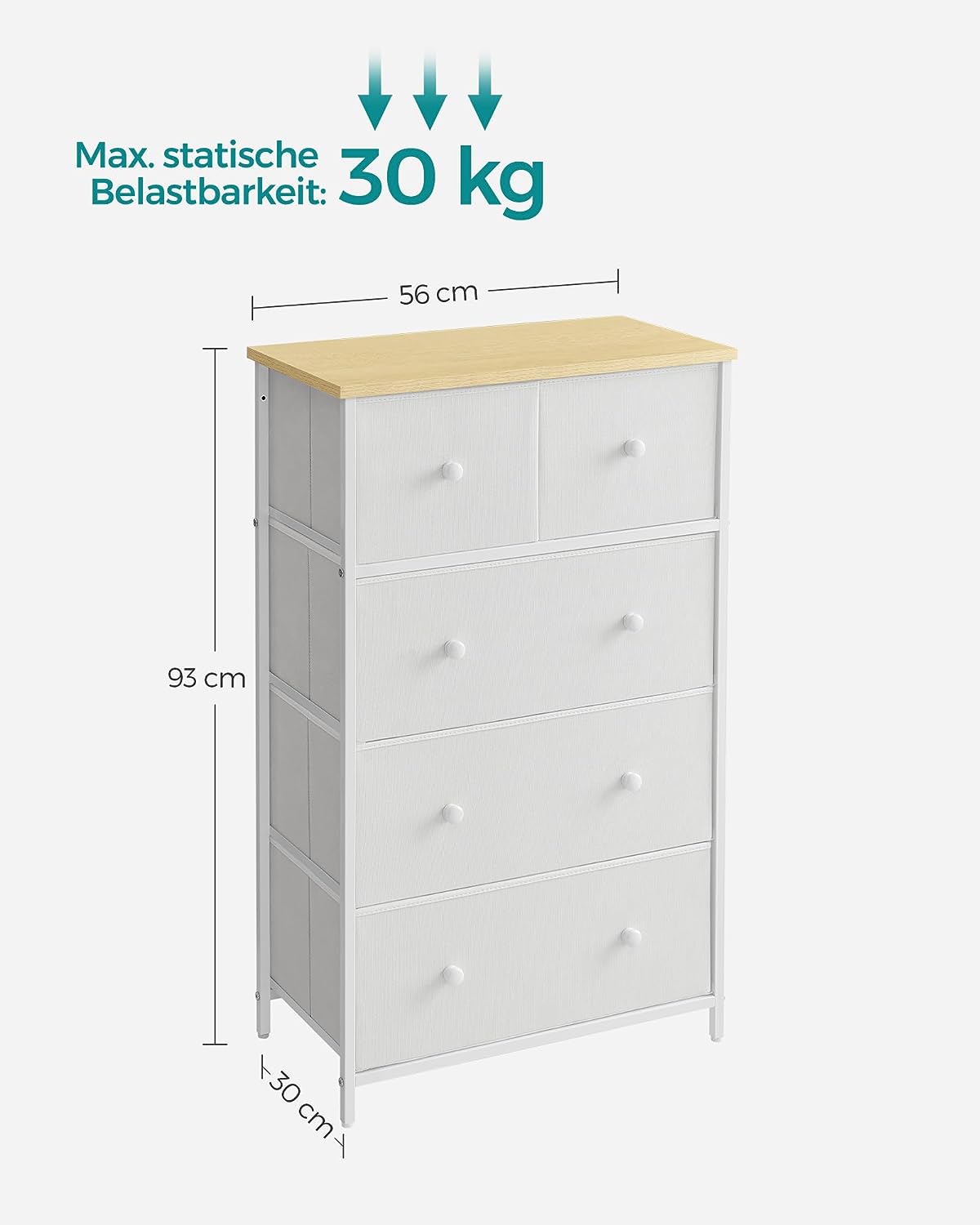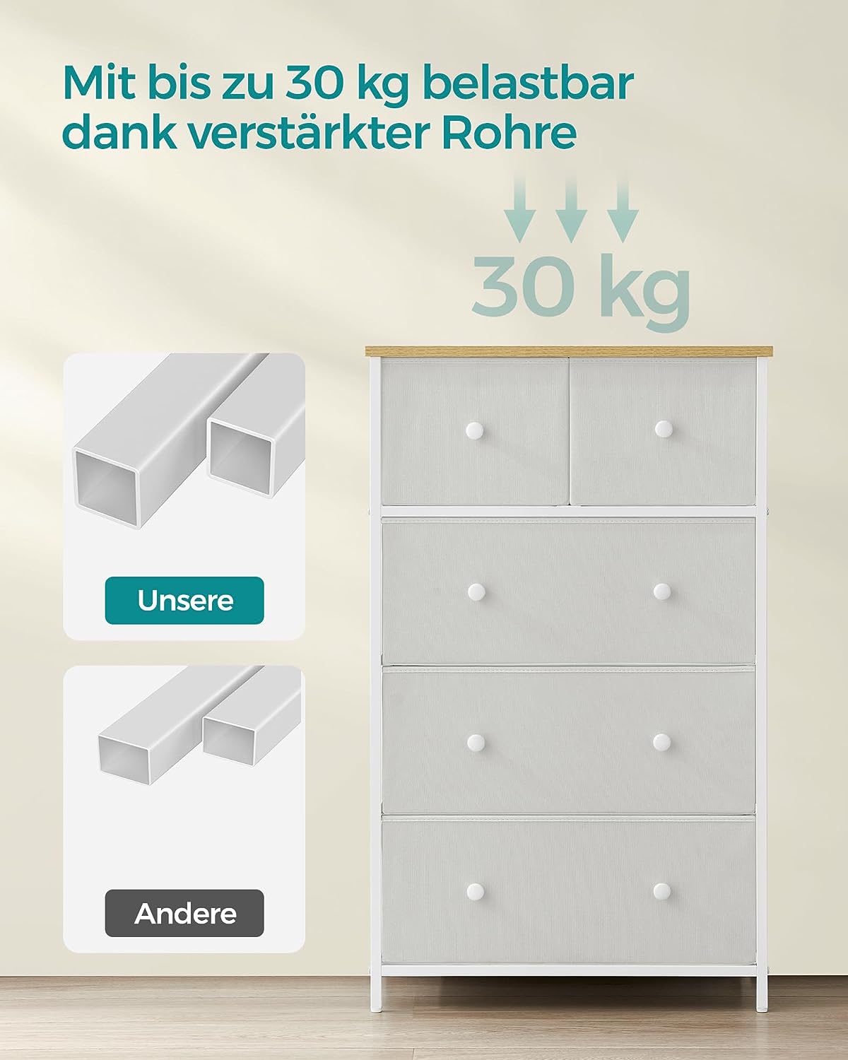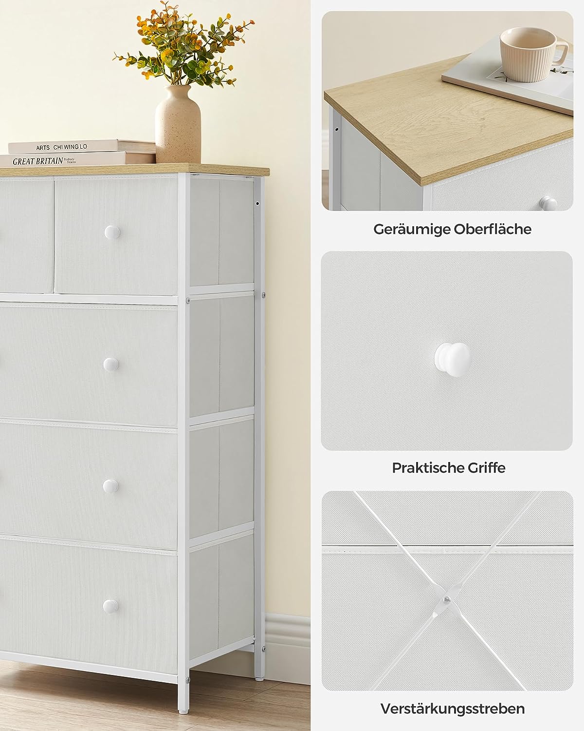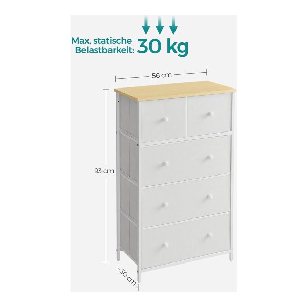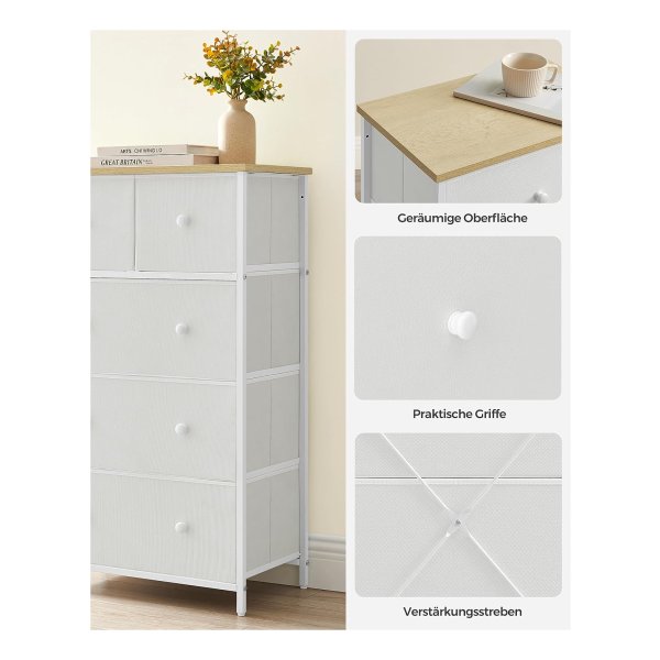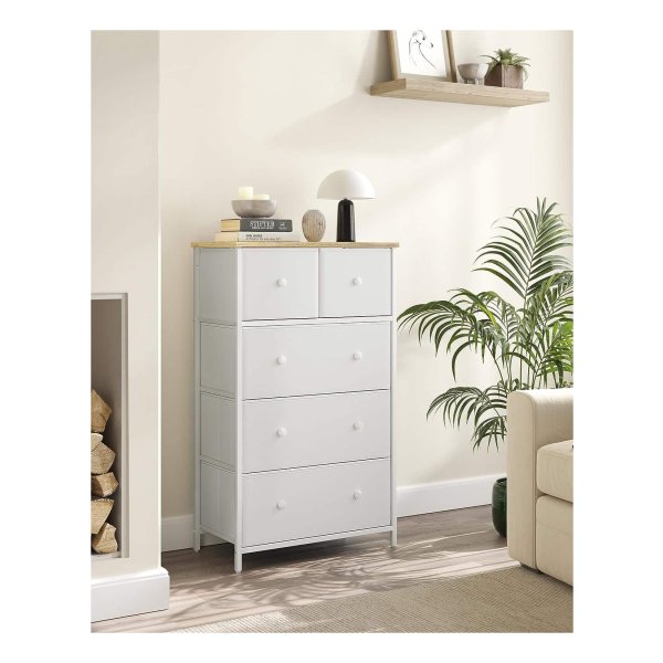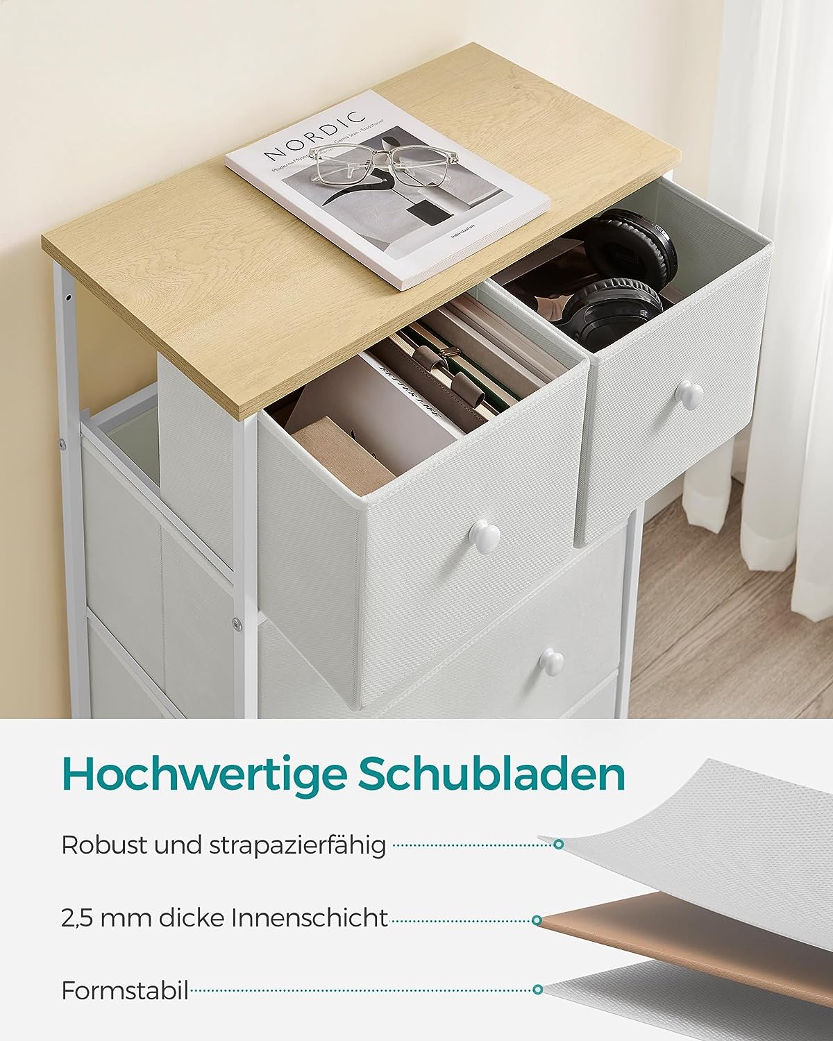 Commode, Opbergkast, 5 Stoffen Laden, Voor Hal, Woonkamer, Wit-Eiken