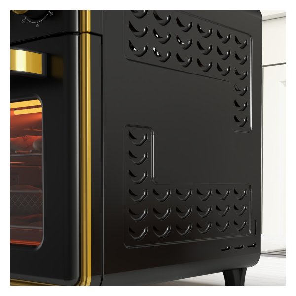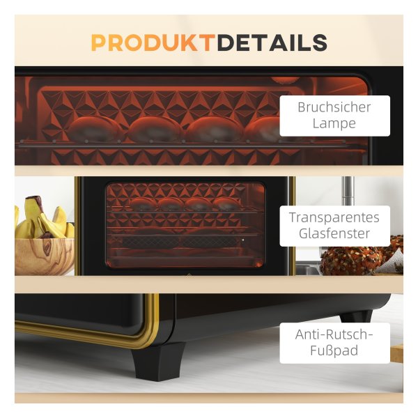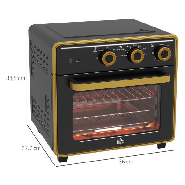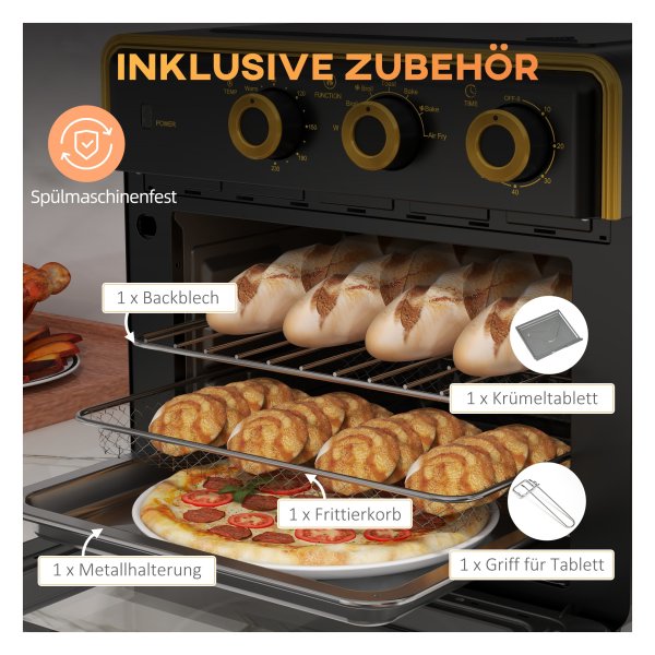 De compacte oven is vervaardigd uit hoogwaardige materialen, zoals ijzer, ABS, gehard glas en roestvrij staal. Met totale afmetingen van 36L x 37,7B x 34,5H cm en diverse accessoires, waaronder 3 rekposities, een ovenrooster, een frituurmand en een bakplaat, ben je verzekerd van een optimale kookervaring. Het kruimelcompartiment vergemakkelijkt het schoonmaken en is vaatwasmachinebestendig, waardoor onderhoud eenvoudig is.