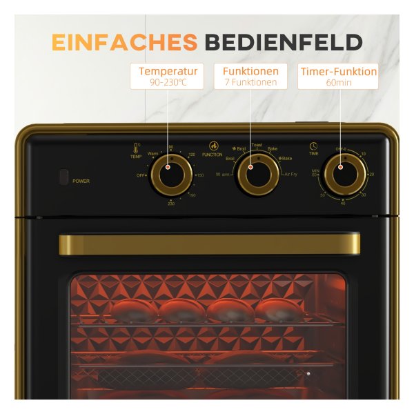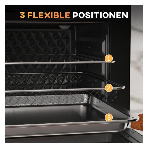 - Het 360° heteluchtcirculatiesysteem garandeert een gelijkmatige en snelle verwarming