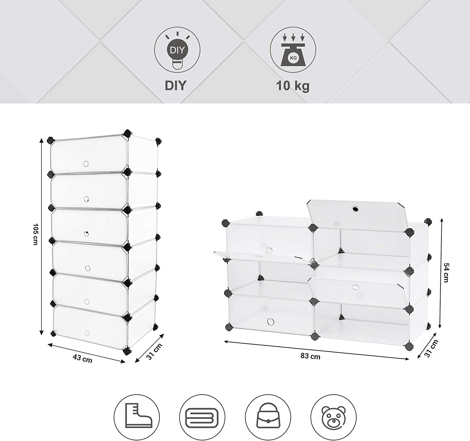 - Deze DIY schoenenrek met 6 deuren is een smalle schoenenkast met 6 niveaus, gemaakt van kunststof. Het is een insteekreksysteem, waardoor je je schoenen gemakkelijk kunt opbergen. Het is een perfecte organizer voor schoenen, waar je tot wel 18 paar in kunt opbergen. De sneakerbox heeft een afmeting van 43 x 31 x 105 cm en is wit van kleur.